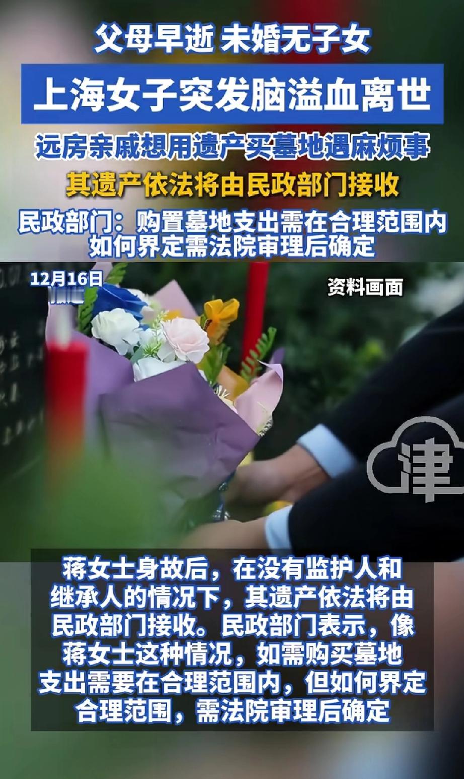 10月,上海一名46岁女子突发脑溢血,于12月14日离世。她父母早亡,自己未婚且无子女,也未留下遗嘱。其远房亲戚打算用她的遗产为她购置一块墓地。 按照规定,该女子的遗产应归民政局所有。 民政局回应称,若要购买墓地,支出在合理范围内可行,但怎样界定合理范围,需由法院审理后确定。 这便是不想结婚、不想生育之人未来的结局吗?财产取之社会,回归社会,给需要的人提供助力,也是不错的选择。 不婚不育的选择,本无对错之分,只是人生道路各异。它有其益处,也存在需承担的代价。 不婚不育适合追求独立、自由与自我实现的人;而婚姻和孩子则适合渴望家庭温暖、愿意承担责任的人。最为关键的是,要选择能让自己心安、幸福且无悔的生活方式。 来源:津云