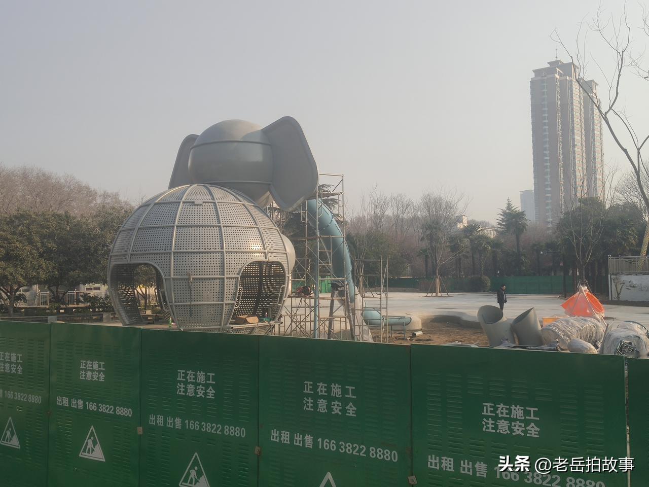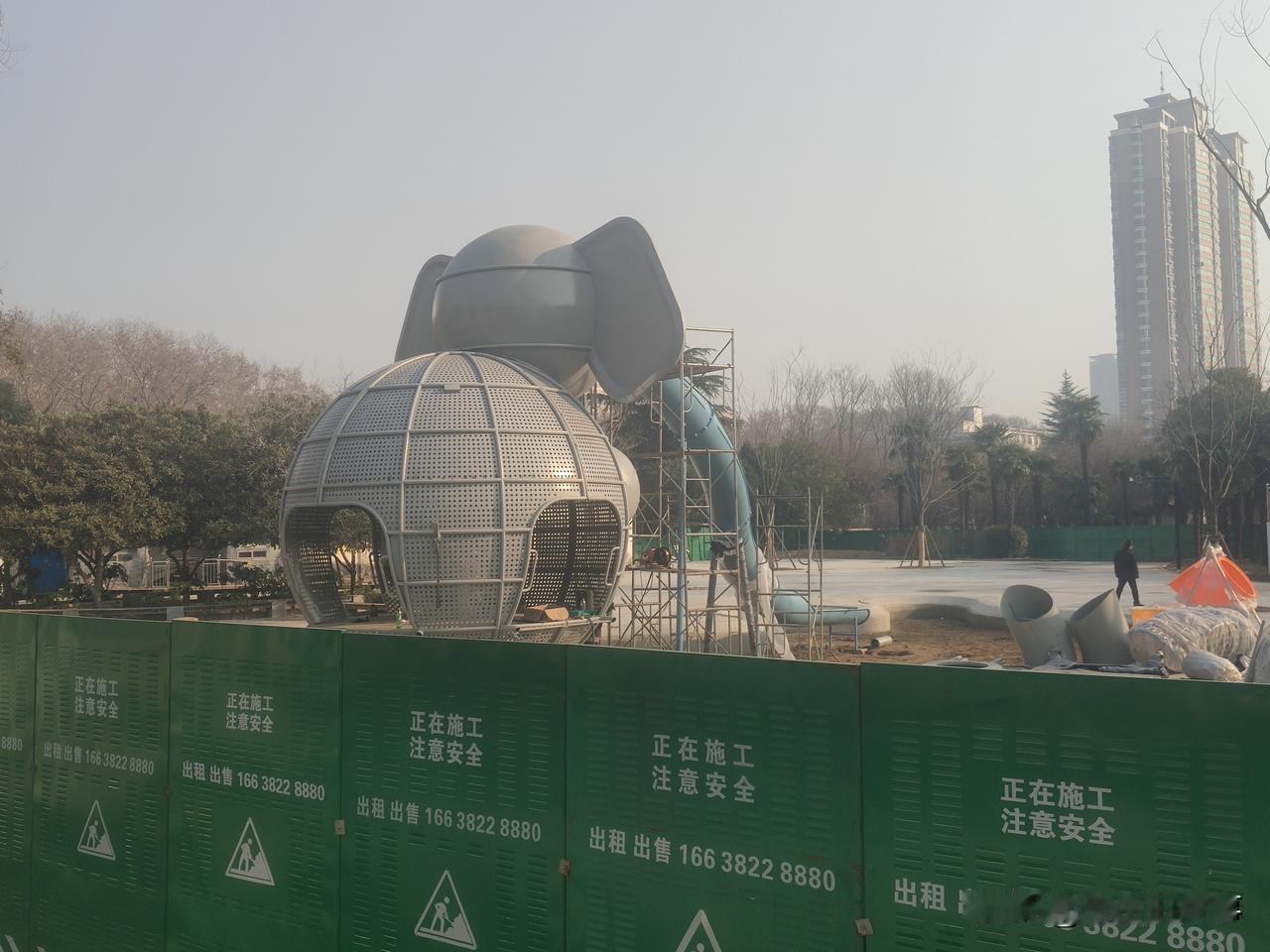 今天上午去郑州市人民公园游玩,看到公园北边一块儿拆除的游乐场地被铁皮围挡围了起来,两个摞在一起的巨大的浅灰色圆球冲破围挡露了出来(如下图),一些有好奇心的游人,凭借围挡外面的一些平台登上去向里先睇为快。站在高处向里观看,看到里边有人正在紧张施工,下面是一个巨大的带有开口的网状圆球体,圆球体的上面是又一个浅灰色的密封圆球体,圆球体的东边一根像大象鼻子一样的圆柱蜿蜒盘旋到地面上。有人看后猜测这应该是一个大型滑滑梯,和其它供小朋友玩耍的娱乐设施。
