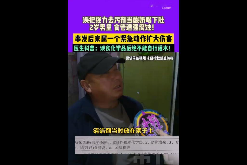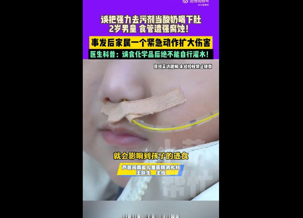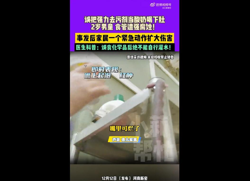 近日,河南郑州 2 岁男童乐乐,在奶奶打扫时误将去污膏当作酸奶服下,致嘴角起泡、口腔食管溃烂。奶奶心急之下灌水,引发肠胃腐蚀大出血。 目前乐乐需多次手术治食管狭窄,费用近 20 万。 其家庭本就困难,女儿刚骨折出院,此事暴露家庭化学品管理不当、急救知识匮乏问题,网友呼吁加强家长防护意识与社区急救培训。 去污膏这类强腐蚀性化学品,竟没放在孩子够不到的地方,还让孩子误认成酸奶,可见家长对 “居家危险” 的认知有多薄弱。 很多家庭总觉得 “孩子小够不着”“偶尔放一下没事”,却不知正是这些 “侥幸”,给孩子埋下安全隐患。 把危险物品锁好、贴清标识,本是举手之劳,却能避免很多伤害。 奶奶灌水的举动,看似着急救孩子,实则因不懂急救常识加重了伤害。 医生早就强调,误食化学品不能盲目催吐、灌水,可很多家长没听过、没学过,遇事只能慌不择路。 这不仅是个人知识的缺失,更反映出社区急救培训的不足 —— 若能提前教会家长正确处理方法,孩子或许就不用多受这份罪。 近 20 万手术费、女儿刚骨折、儿子又重伤,接二连三的变故让这个家庭雪上加霜。 对普通家庭来说,一次意外可能就是 “经济与心理的双重灾难”。 除了家长自身要做好防护,社会也该多些支持:社区多开展免费急救课、医院提供公益医疗帮助,别让 “没钱治”“不会救” 成为压垮家庭的最后一根稻草。
