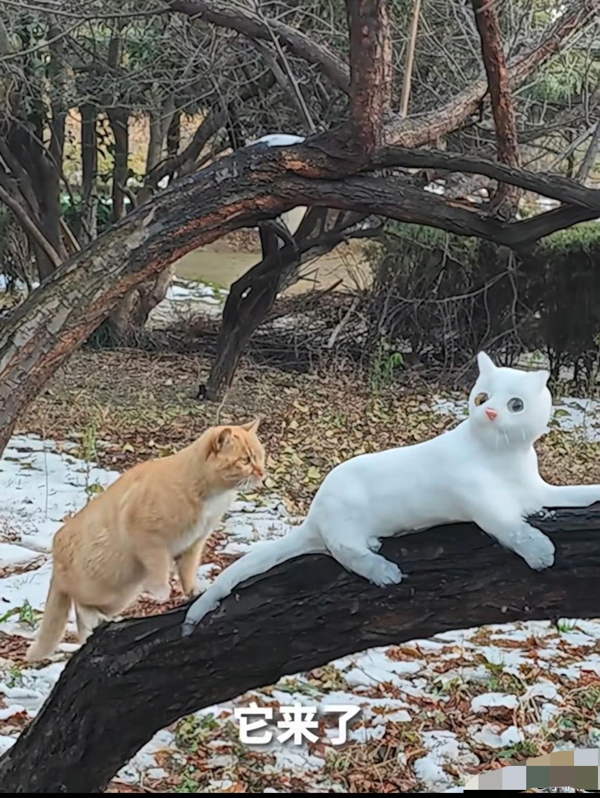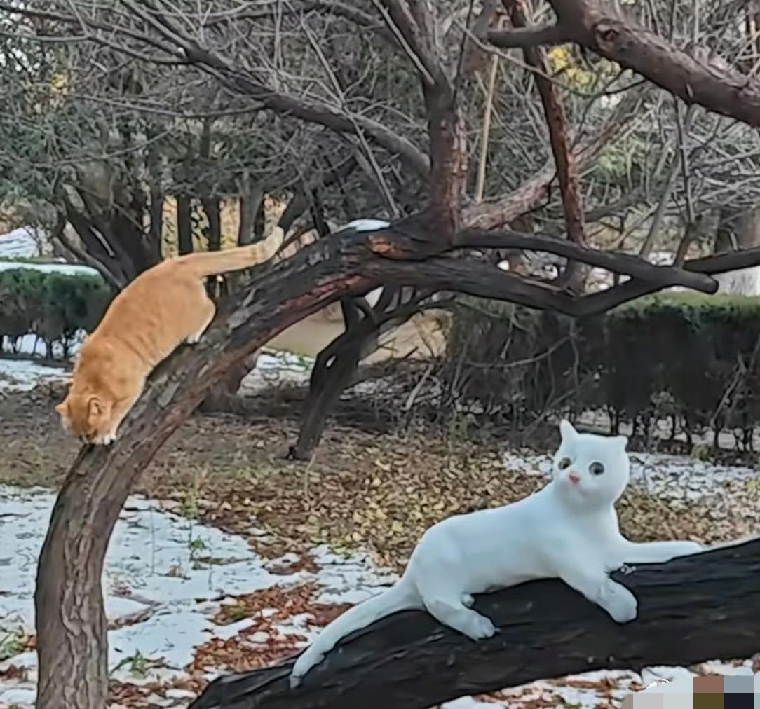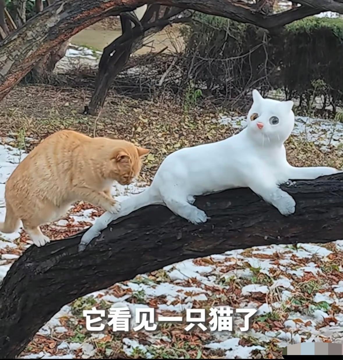 开封新新幼儿园附近公园,一副猫捉老鼠的雪雕,吸引了一只真猫,妙趣横生。不知道是哪个雕塑爱好者所为,在下雪后的开封公园,即兴手作。通体白色的猫趴在枝干上,前面是一只夺命狂奔的老鼠,一只黄猫跑来凑热闹,也想来分一杯羹。哈尔滨雪雕 猫卡通雕塑