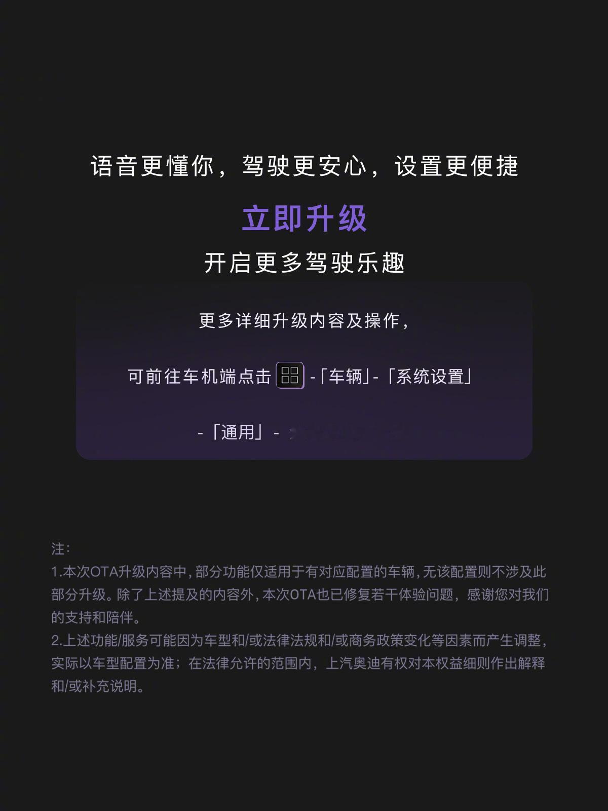 我的车今天好像有情绪了 AUDI这个OTA速度就很新势力嘛。E5 Sportback迎来首次OTA升级。本次升级聚焦奥迪助手、视觉动效、交互逻辑与副驾协同四大核心领域,新增10多项功能,并优化了200多项用户体验。感觉把大家觉得有槽点的地方都针对性的做了优化调整,这才是 OTA 的价值。看来奥迪不止充电,电机,驾驶跟上课了,软件也开始跟上节奏了。AUDI迎来大规模OTA