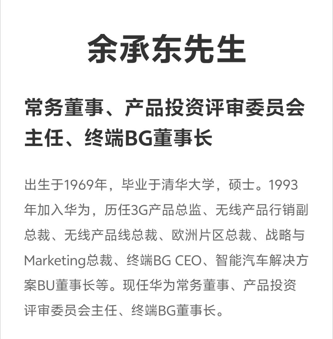 孟晚舟卸任华为终端公司董事 余承东接任华为终端有限公司董事长,不得不说,余总这履历太丰富了。历任3G产品总监、无线产品行销副总裁、无线产品线总裁、欧洲片区总裁、战略与Marketing总裁、终端BG CEO、智能汽车解决方案BU董事长等。现任华为常务董事、产品投资评审委员会主任、终端BG董事长。 余承东任华为终端公司董事长