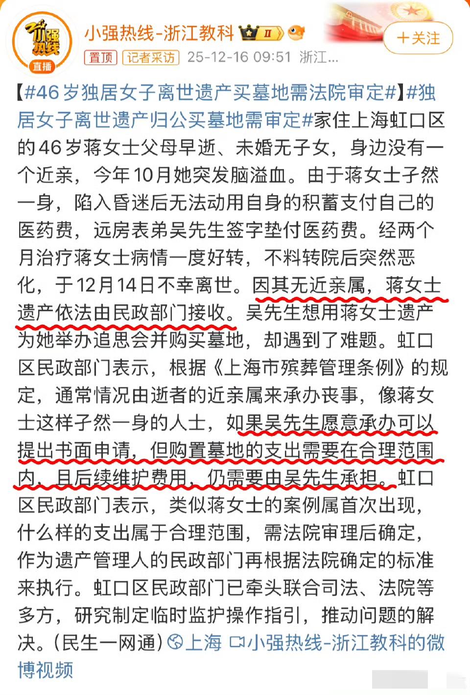独居女子离世遗产归公,买块墓地竟要法院审定?这波操作看懵了! 46岁独居女子突发脑溢血离世,父母早逝、未婚无子没法定继承人,遗产直接归国家所有,结果亲友想用她自己的钱买块墓地办后事,居然还要等法院审定才行![震惊] 说出来都让人揪心,远房表弟和同事垫付医药费陪她走完最后一程,想帮她办个体面后事,用她自己的遗产花点钱都没辙。没明确标准不敢动"公有"遗产,只能走法律程序定"合理支出",连买墓地花多少钱都要法院说了算,这流程也太僵硬了! 提醒大家:法定继承人只有配偶、子女、父母和兄弟姐妹这些近亲,远房亲戚根本没继承权,没继承人的遗产直接归国家。[划重点] 独居的朋友真得提前规划! 网友调侃“看来得趁活着把钱花完”,但正能量说句:提前立遗嘱就能规避这些问题!想给帮过自己的亲友、甚至捐慈善都可行。 你觉得无继承人财产该归国家还是旁系亲属?如果是你会提前立遗嘱吗?评论区聊聊~ 独居女子离世遗产归公买墓地需审定 遗产继承那些事 法律常识科普