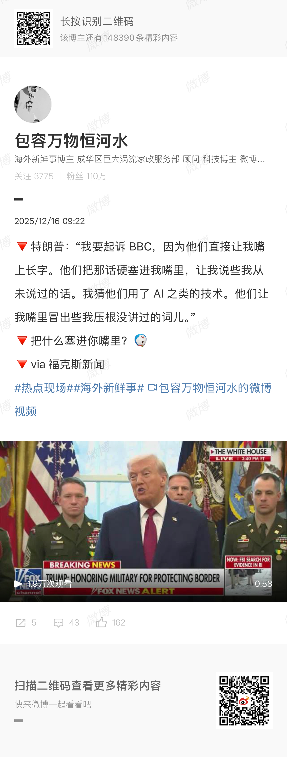 🔻福克斯新闻报道:特朗普针对英国广播公司(BBC)提起 100 亿美元天价诉讼。🔻声称“因其 2024 年纪录片《广角镜》扭曲了我关于 1 月 6 日事件的言论。”热点现场海外新鲜事