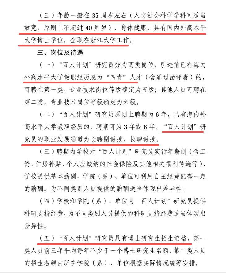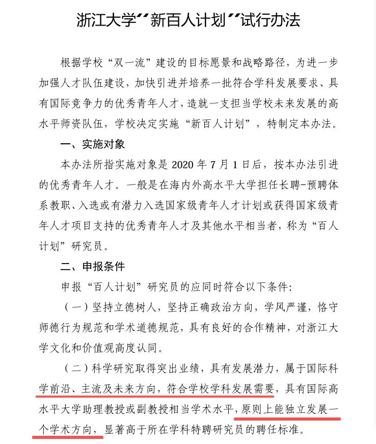 浙江大学2020年6月下发的“新百人计划”,对参选人员提出3个资格条件:一是品德