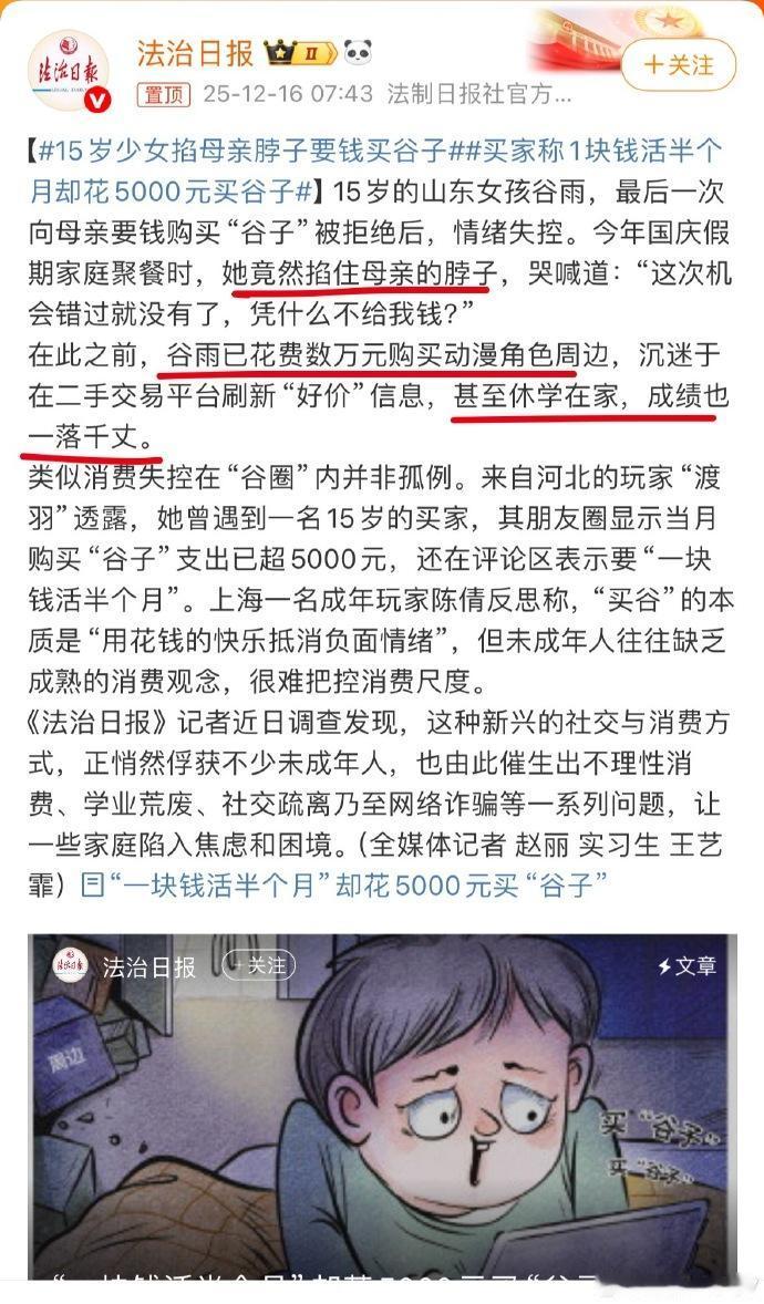 山东 15 岁女孩谷雨沉迷买动漫周边 “谷子”,花数万元还休学,家庭聚餐时因母亲拒付高价周边费用,竟掐住母亲脖子。 她曾想靠二手平台 “低买高卖” 维持消费,却荒废学业、破裂亲情。 河北也有 15 岁买家月花超 5000 元买 “谷子”,还说要 “一块钱活半个月”。 2024 年中国 “谷圈经济” 达 1689 亿元,18 岁以下占 18%,且存在劣质材料、诈骗等问题。 我们可以看到这虚拟的招牌太坑了,把 “情感陪伴” 当圈钱幌子! 商家打着 “限定款”“社群归属感” 的招牌,把普通周边炒到天价,说这是 “实体化情感陪伴”,其实就是抓着孩子孤独的心理骗钱! 7.2 万元的稀有徽章,哪是支持 IP,是把孩子当提款机,把 “情感” 做成了割韭菜的工具,恶心! 当然,这也说明了这孩子太缺爱了,现实生活中没人陪伴才找虚拟寄托! 谷雨把 “谷子” 当精神支柱,还有浙江小学生甚至因孤独想自杀,这说明孩子在现实里没得到足够关注。 家长要么给钱不管,要么暴力制止,根本没听孩子说为啥喜欢,孩子只能躲进虚拟世界,最后被商家和孤独逼得失控,多可怜! 说实话,这是孩子经典成长过程弄丢了,别让虚拟消费替代真实生活! 以前孩子喜欢东西,会自己画、跟朋友聊,现在却成了 “花钱买认同”。 商家把青少年的孤独焦虑变成利润,家长又没引导,让孩子忘了真实的成长该是啥样。 再不管,孩子只会越来越沉迷,连怎么跟人相处、怎么踏实生活都不会了,这不是养孩子,是毁孩子!