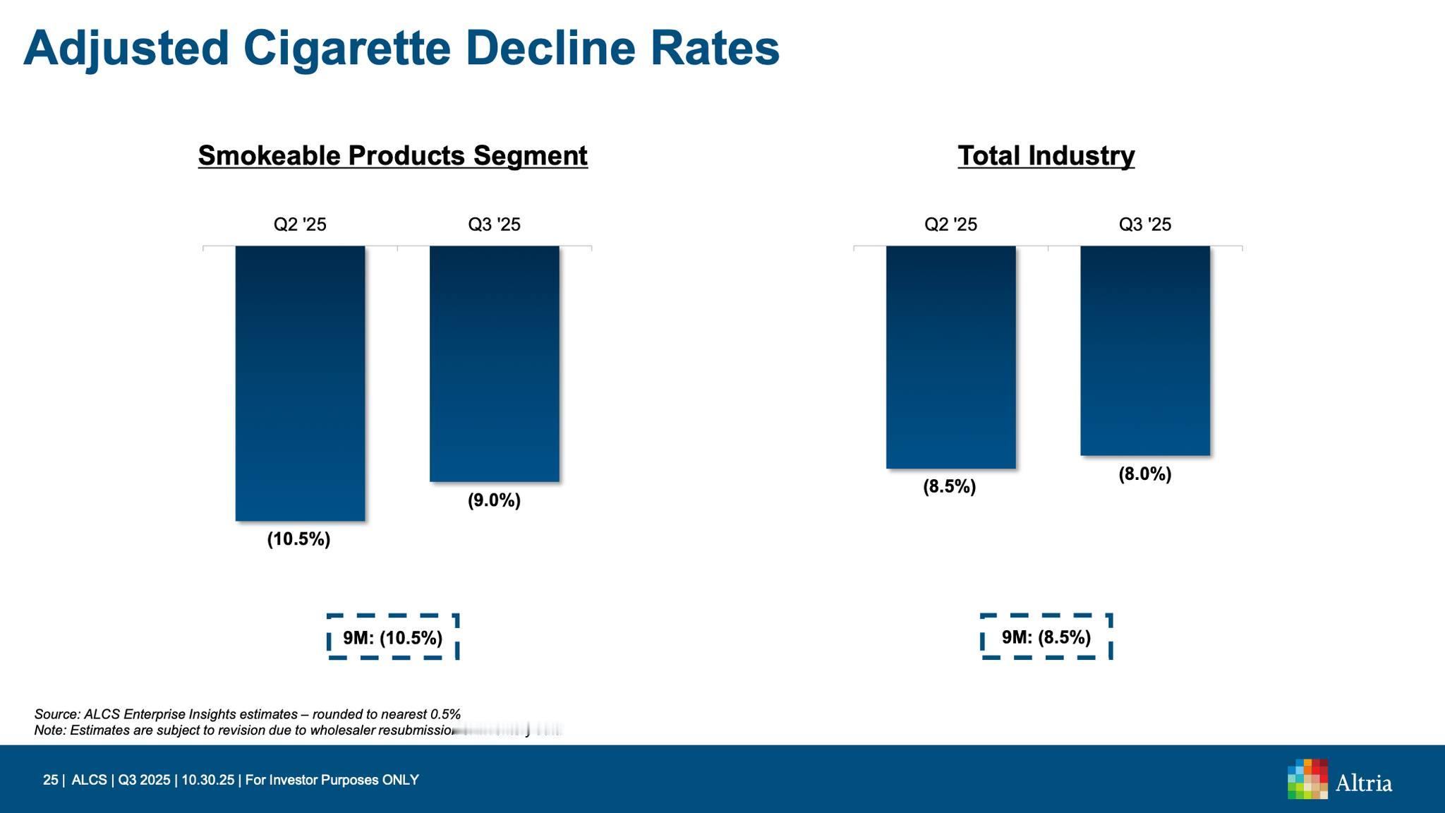 [财报里的故事] Altria Group 万宝路失血、低价烟崛起,以及写在市占数字里的消费降级在进入财报之前,先把主角说清楚。Altria Group (NYSE: MO) 是一家以美国市场为主的烟草与尼古丁产品控股公司。你熟悉的万宝路 (Marlboro) 在美国的制造与销售,主要由其子公司负责;同一个集团也同时拥有无烟烟草品牌,如 Copenhagen、Skoal,雪茄品牌如 Black & Mild,口含尼古丁袋 on!,以及电子烟品牌 NJOY。华尔街总是喜欢听好听的故事,例如「连续多年股息增长」或「击败预期的每股盈余」。在 2025 年 10 月底,Altria Group 公布第三季度成绩单时,表面上确实维持了烟草巨头的体面。调整后每股盈余 (Adjusted diluted EPS) 年增 3.6% 至 1.45 美元,并宣布把股票回购计划扩大至 20 亿美元。 然而,若把视线从每股盈余这个最容易被市场追捧的指标移开,你会看到另一组相对冷淡的讯号。净营收下滑 3% 至 60.7 亿美元,而核心纸烟业务的实际出货量趋势也在走弱。 这不是一份单纯的成长报告,细看你会发现,这更像是一份成熟巨头在结构性的衰退中,努力维持秩序的检验单。▎繁荣的假象:当企业不再扩张,只好把数字做得更好看我们先抓住这份财报最核心的矛盾。营收在收缩,EPS 却在增长。这种背离不是魔法,而是一套成熟公司常见的资本剧本。当一家公司难以再靠「卖出更多产品」扩张,它往往会把战场改到另一个地方,开始追求「每股表现」的优化,并把资本配置当成主要工具。换句话说,与其扩大分子,不如先把分母调整得更漂亮。Altria 其实也在自己的说法里透露了线索。它将 EPS 上升的一部分原因归结为股数下降,以及其他损益表现的改善,这等于在提醒市场,这次的亮眼并不完全来自需求变强,而是来自财务结构与配置策略的加成。因此,投资人眼前的高股息与稳定回购,更像是一种用现金流换取时间的安排。它确实带来可观的回报感,但也同时意味着,公司正在用更成熟、更财务化的方式,去对冲成长天花板逐步逼近的现实。▎消费降级正在发生:万宝路失血、低价烟崛起在这份财报里,最值得盯紧的不是 EPS,而是纸烟「量」的变化。公司揭露,若排除库存波动与日历因素,纸烟出货量实质上约下滑 9%。这会把问题推回更根本的层次:市场到底是「人变少了」,还是「钱变薄了」,让原本仰赖定价权的模式开始出现裂缝?更刺眼的讯号出现在万宝路 (Marlboro) 的零售市占率。这个曾经的霸主,在一年内下滑 1.2 个百分点,降至 40.4%。同一时间,较低价的烟品市占率却逆势上升 2.4 个百分点,来到 32.2%。这种一降一升,很难只用口味偏好来解释,它更像是一种明确的「消费降级, trade down」痕迹。在通膨与生活成本压力长期盘旋的年代,房租、食物与能源已经先把家庭预算切走一大块。对高度价格敏感的老烟枪而言,选项往往不再是「戒」或「不戒」,而是「改抽更便宜的」。当消费者成群结队地离开万宝路、转向低价替代品时,Altria 以往引以为傲的定价权,也就会在购买力的现实压力下,变得越来越吃力。▎新世代尼古丁:输的不只是产品,而是「谁更酷」如果说纸烟代表过去,那口含烟 (nicotine pouches) 就是现在进行式。它是一种把尼古丁放进小袋中、置于上唇与牙龈之间使用的产品,通常不需要燃烧,也不会产生烟雾,因而被包装成更「干净」的新世代尼古丁选项。但在这个最能代表「新尼古丁时代」的战场上,Altria 的处境并不理想。公司揭露,旗下 on! 在口含烟类别中的市占率下滑至 15.6%,这透露出它并没有在这波浪潮里掌握消费偏好,与通路节奏的主导权。更尴尬的其实不是口味或定价,而是品牌背后的生活想象。当竞争拉高到「谁能定义酷」的层次时,旧帝国的语言往往显得迟缓,而文化认同这件事,也很难只靠折价策略买回来。▎当灰色电子烟占上风:合法品牌只能等政府出手转到电子烟 (e-vapor) 战场,Altria 把「无烟转型」的重要筹码押在 NJOY 上。它的目标其实很直接,就是在合法合规的框架里,把产品做成能被通路稳定上架、能被监管允许长期贩卖的选项,用来补上纸烟下滑后,所留下的市场缺口。但这场仗真正棘手的地方在于,NJOY 面对的对手往往不是另一个同样合规的品牌,而是铺天盖地的非法一次性电子烟 (illicit disposable vapes)。当灰色产品用更低的价格、更强的口味、以及更快的上新速度席卷市场时,合法品牌即使努力推进通路、扩充品项,也很难在同一个起跑在线竞争。因此,Altria 在 e-vapor 的胜负关键,常常不在于它能不能把 NJOY 再做得更好,而在于市场能不能回到一个「合规者才能有生存空间」的状态。这也解释了它为什么必须高度依赖 FDA 的执法强度,去压制非法市场,以便为合法产品净空市场赛道。▎结语:高股息的背后,是一场与时间的赛跑对投资者而言,Altria 现在正处于一个巨大的矛盾。乍看之下很像一张按期配息、定期付息的高息债券,让人容易把它当成稳定现金流的来源。但如果你真的买进它,你押注的可能不是获利成长,而是它能否「衰退得足够慢」,并在这段缓慢下行的过程中,依然维持稳定的现金流与资本利得。这家公司正在经历一场痛苦的转型。它试图卸下纸烟帝国的重量,转向无烟产品与新尼古丁品类,却发现新时代的门票早已被更懂文化、更懂通路、更懂节奏的对手抢先占位。对它而言,转身不是不可能;只是代价很高,而且时间也许并不站在它这边。万宝路的牛仔正慢慢