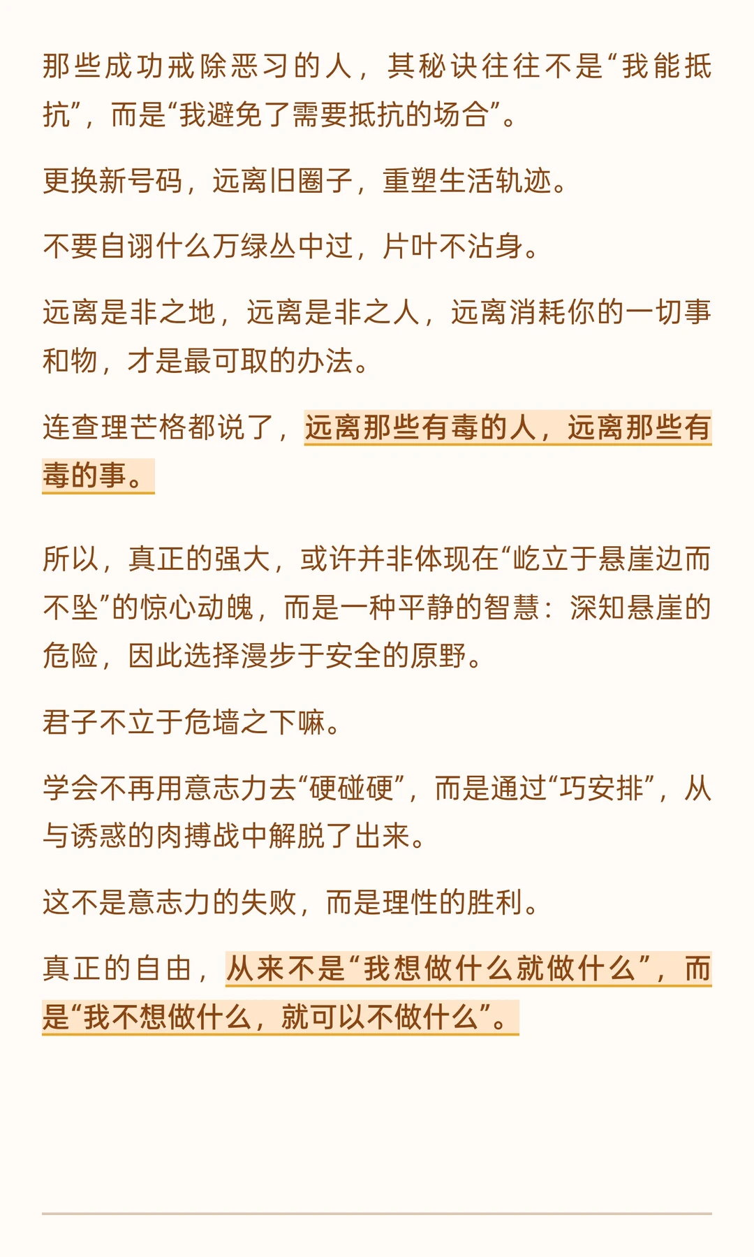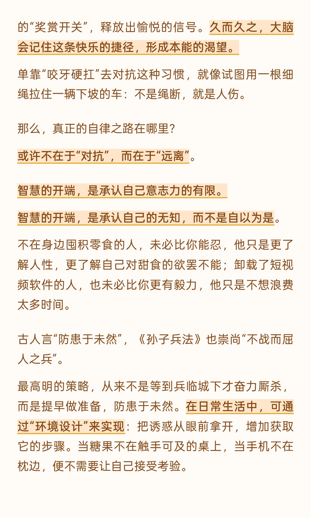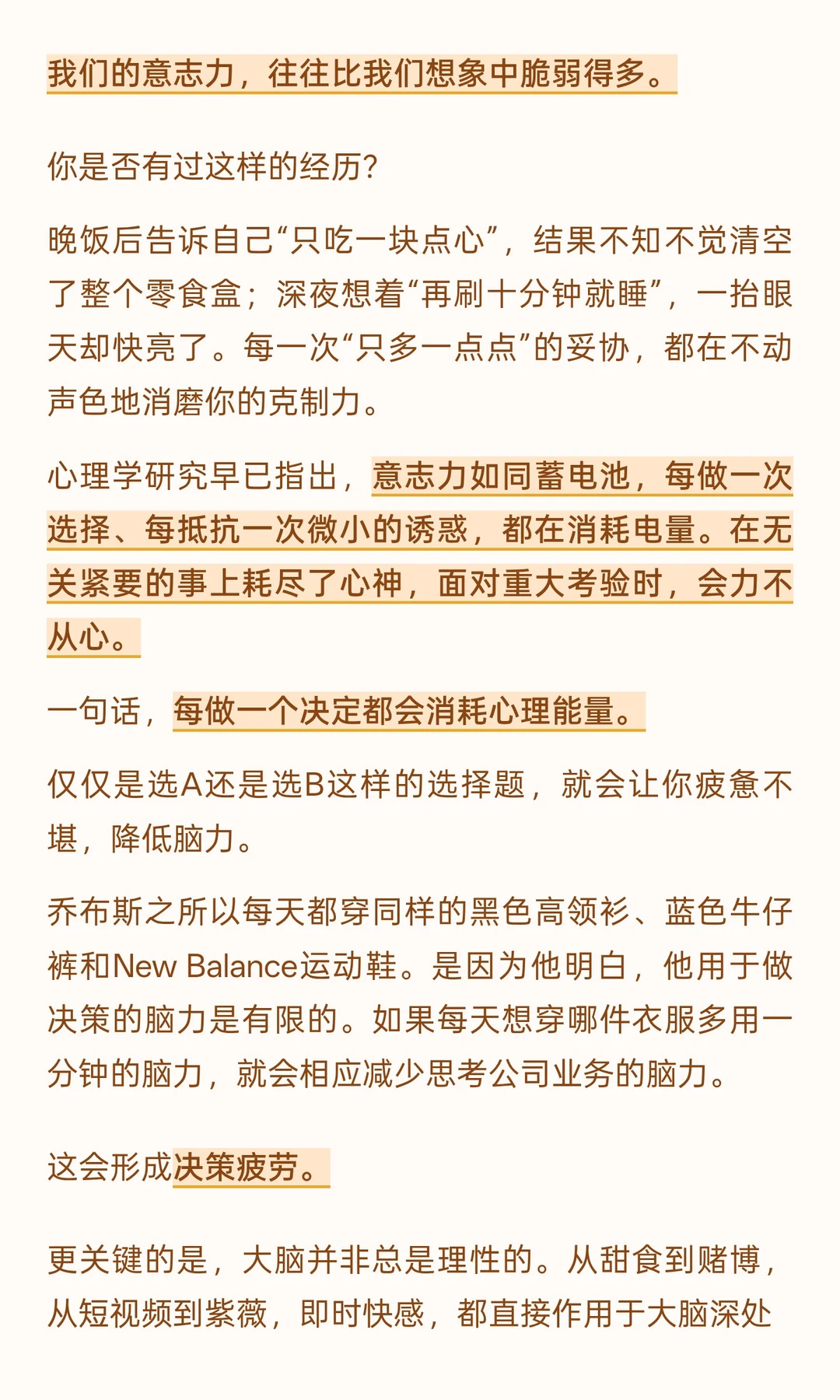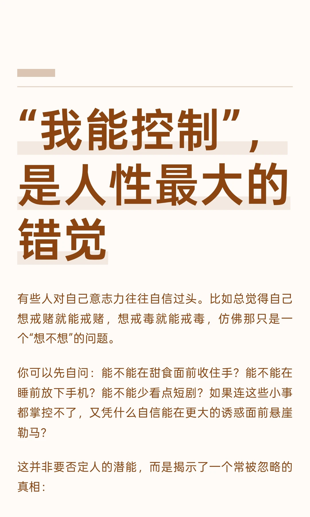 意志力比想象中脆弱,过度消耗会降低控制力。 通过远离诱惑、优化环境,减少决策疲劳,才能更有效地管理自己。 真正的自律在于避免诱惑,而非与之对抗。