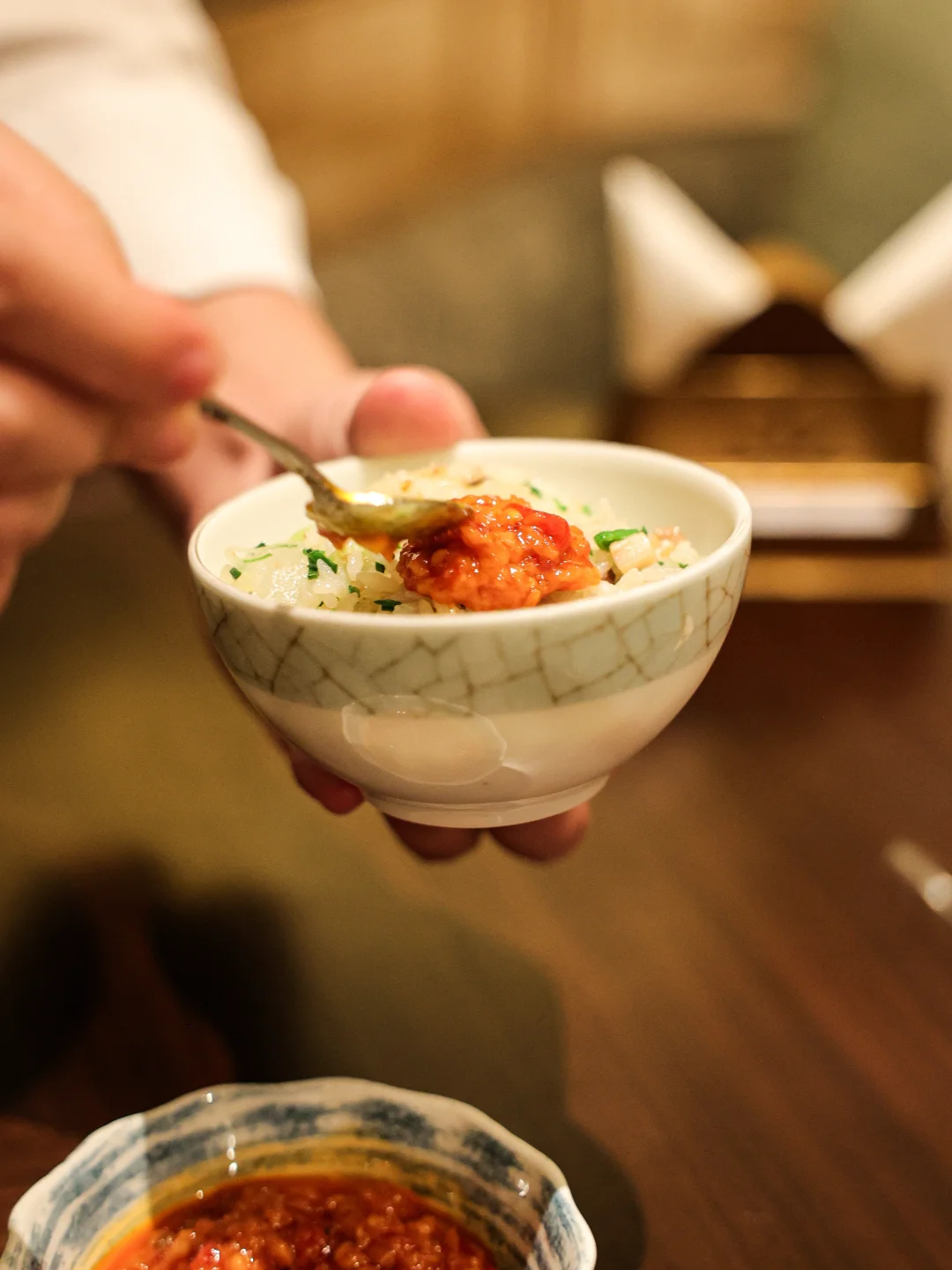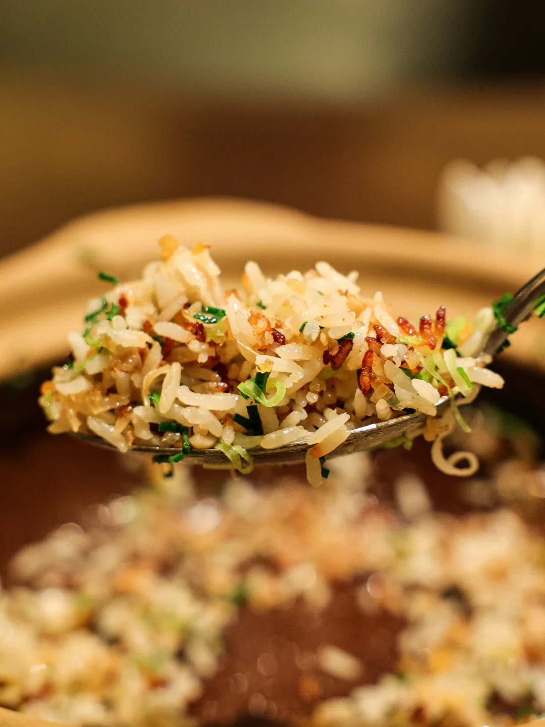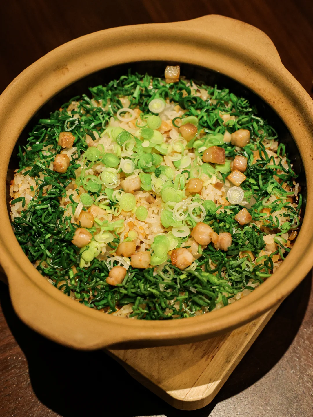 服务员将米饭稍做搅匀之后会帮忙分装。米饭里咸肉的颗粒感与油脂感,紧实有嚼劲;而干贝咀嚼之后能感受到它的纤维感,嚼开之后是浓缩的鲜味。