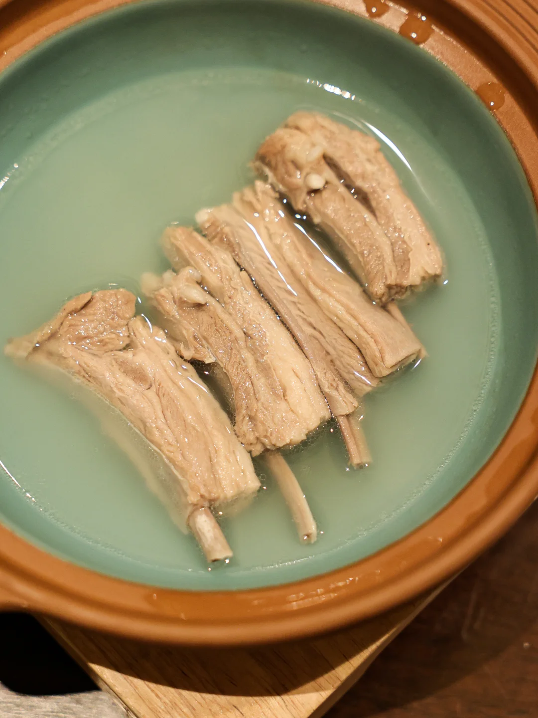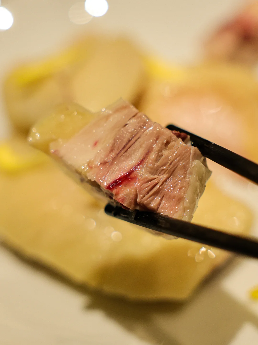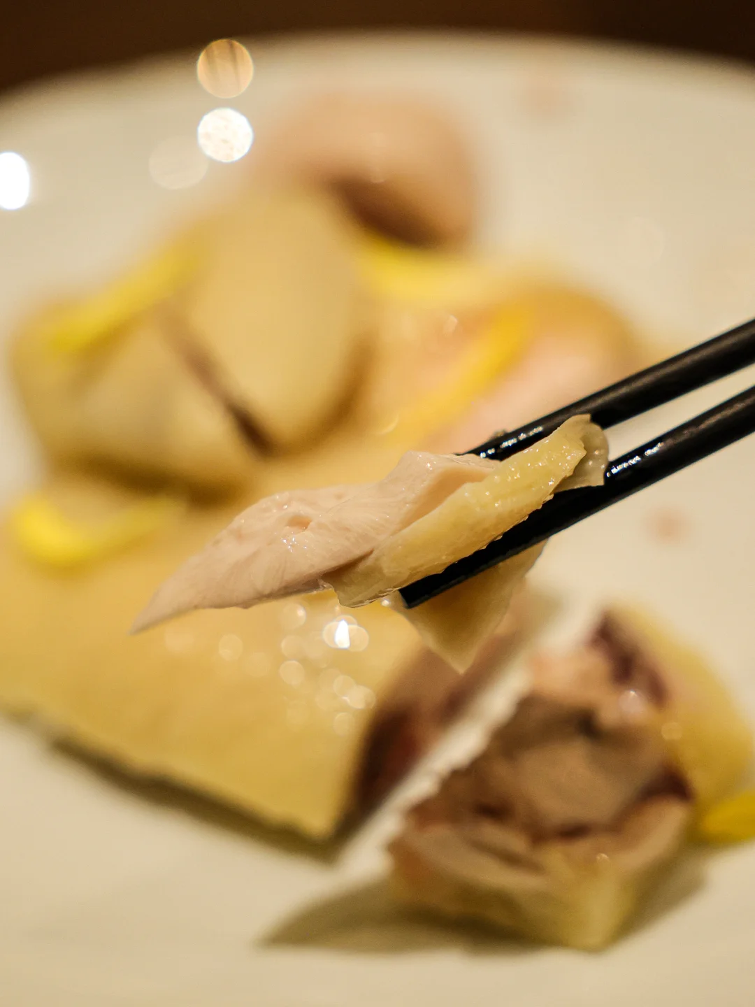 鸡皮是饱和度刚好的黄皮;而精准的火候将鸡肉浸熟的同时,骨中里透着鲜红的骨髓,真如教科书一般。