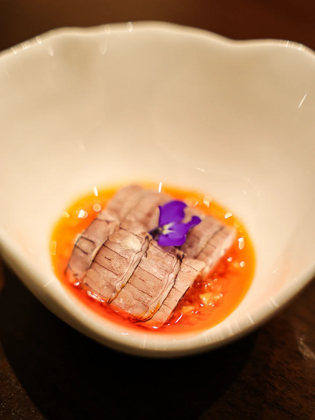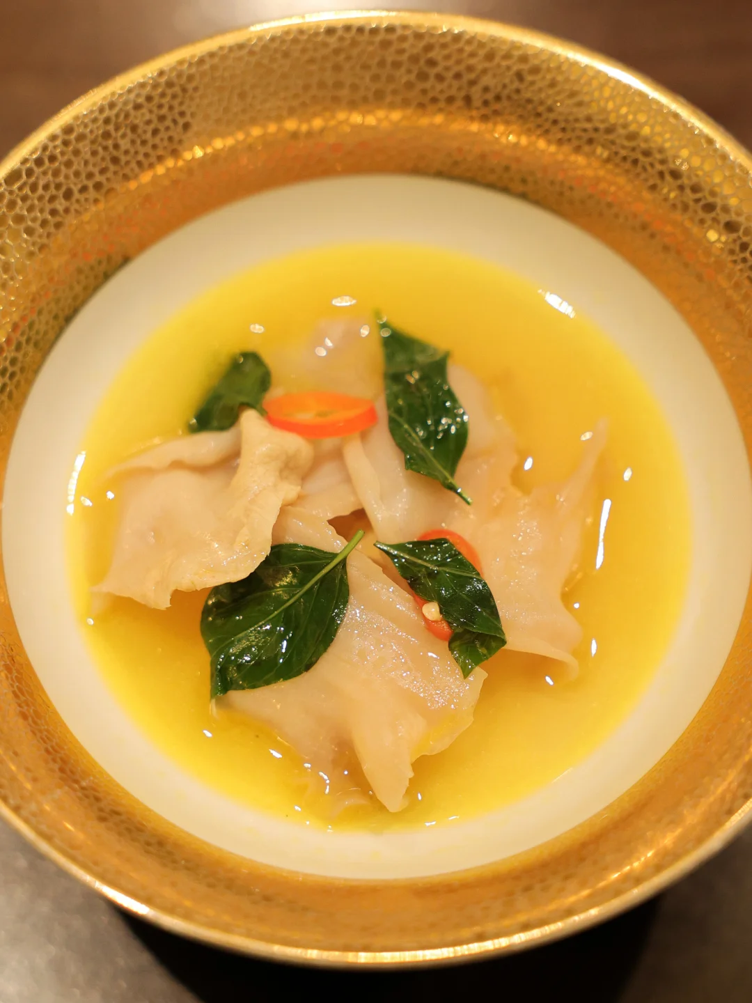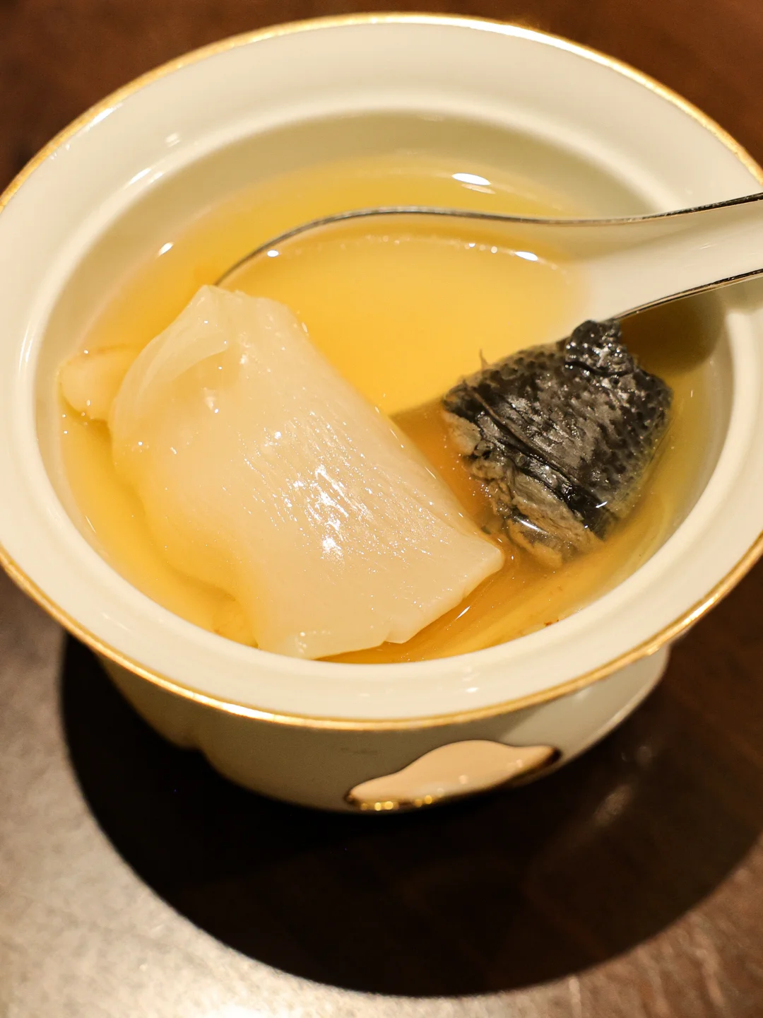 鸡皮是饱和度刚好的黄皮;而精准的火候将鸡肉浸熟的同时,骨中里透着鲜红的骨髓,真如教科书一般。