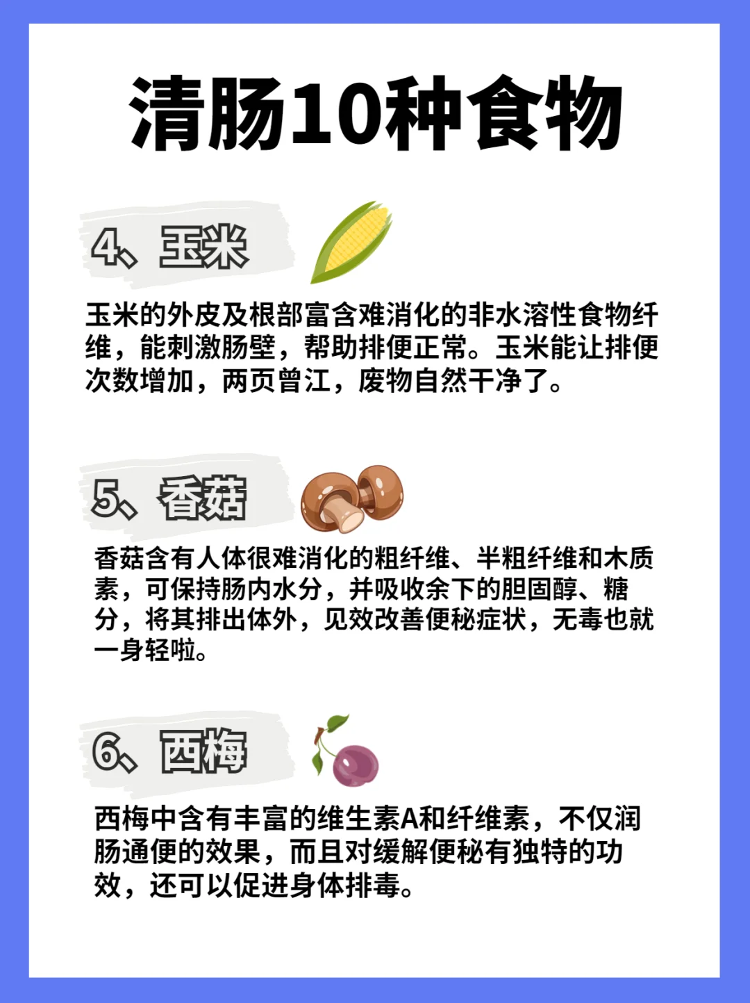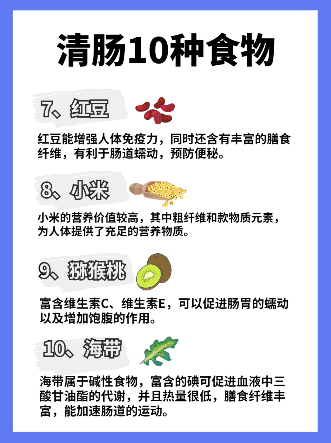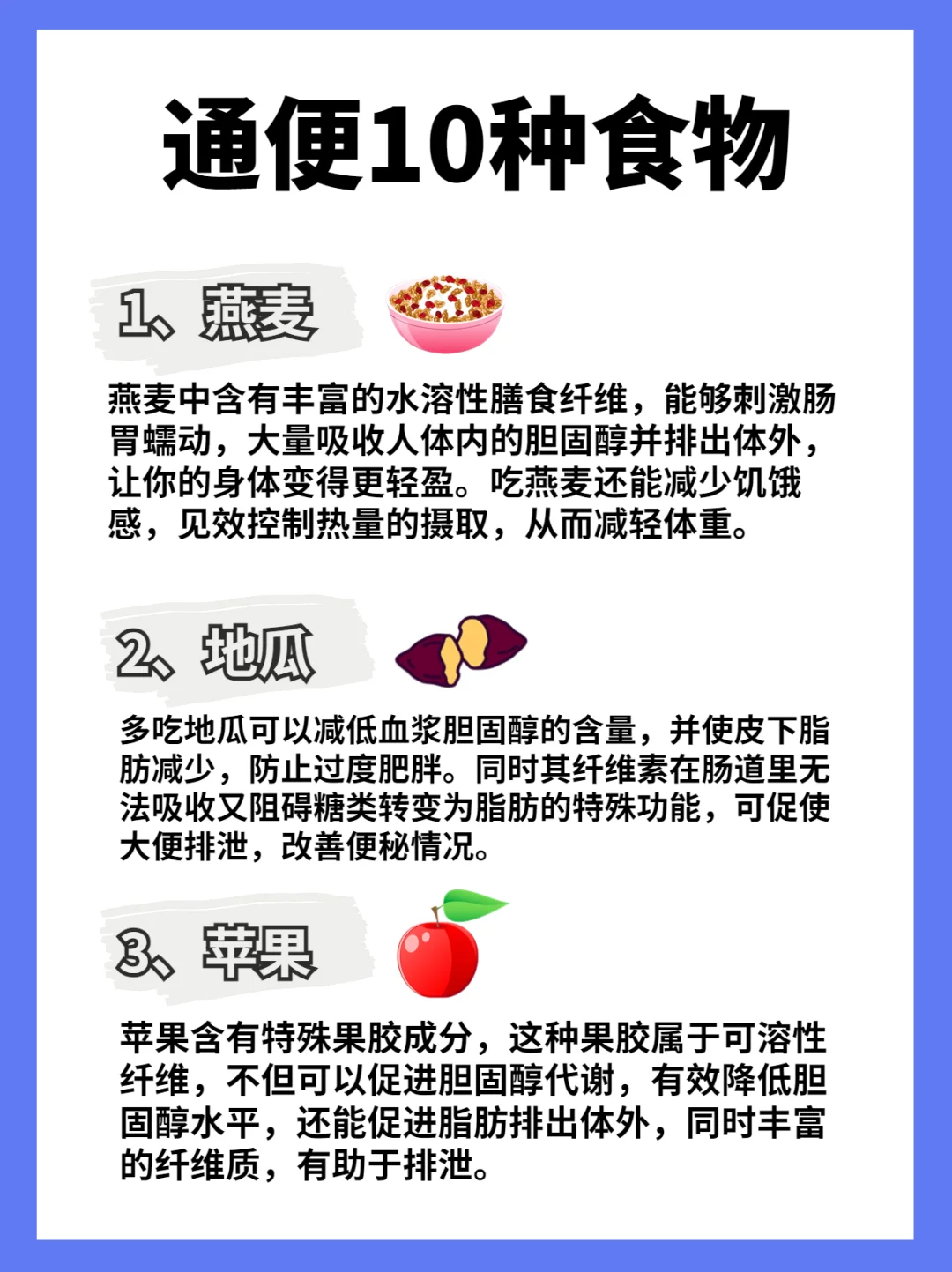 1、燕麦 2、地瓜 3、苹果 4、玉米 5、香菇 6、西梅 7、红豆 8、小米 9、猕猴桃 10、海带 具体怎么帮助排便的看图👆