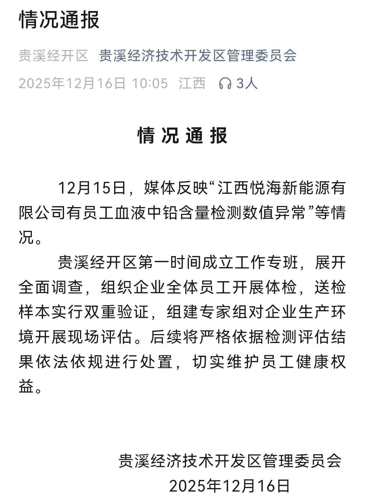 【官方通报“一公司员工血液中铅含量检测数值异常”:成立工作专班,展开全面调查】据“贵溪经济技术开发区管理委员会”通报:12月15日,媒体反映“江西悦海新能源有限公司有员工血液中铅含量检测数值异常”等情况。贵溪经开区第一时间成立工作专班,展开全面调查,组织企业全体员工开展体检,送检样本实行双重验证,组建专家组对企业生产环境开展现场评估。后续将严格依据检测评估结果依法依规进行处置,切实维护员工健康权益。网页链接
