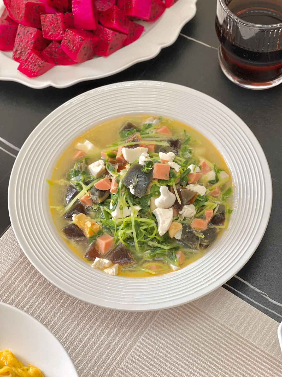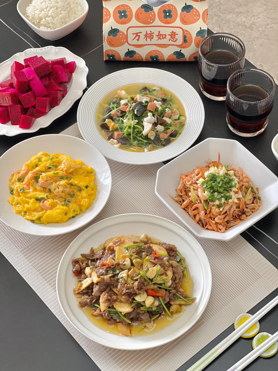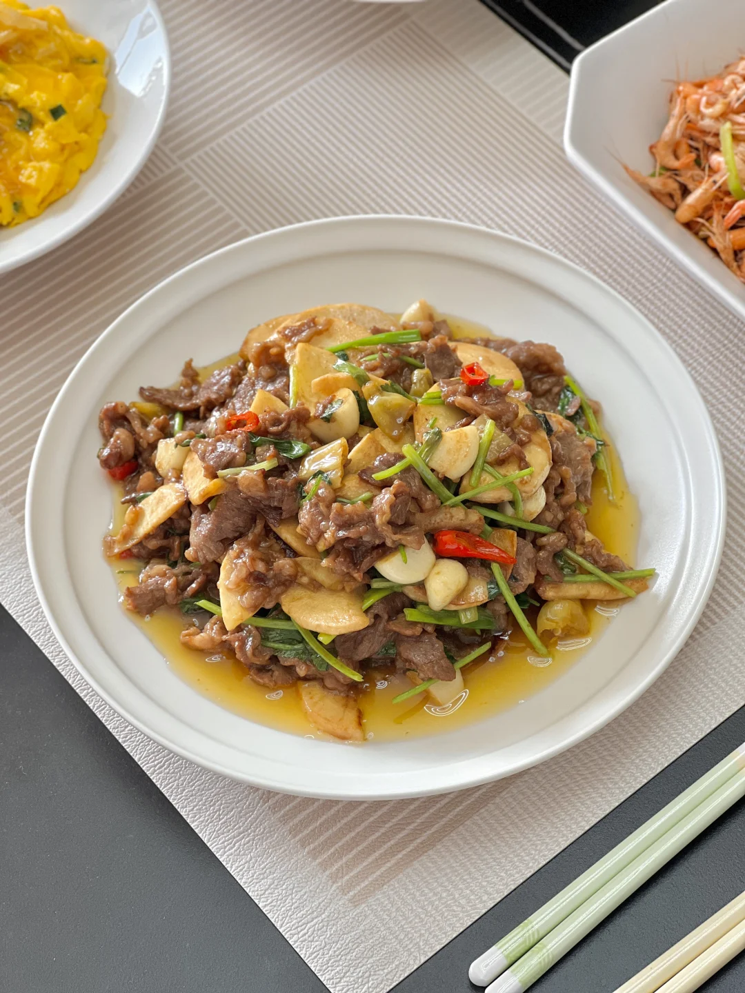 今天又来做小袁拿手的牛肉啦,搭配应季的冬笋,一碗米饭不够吃[偷笑R]经常有小伙伴问牛肉怎么炒不会老,大家可以试试先腌后炒,炒的时候用大火,炒到变色即可,然后再回锅跟菜一起炒一下就好啦~ 【冬笋炒牛肉】 【蟹柳滑蛋】 【上汤豌豆苗】 【油淋小河虾】
