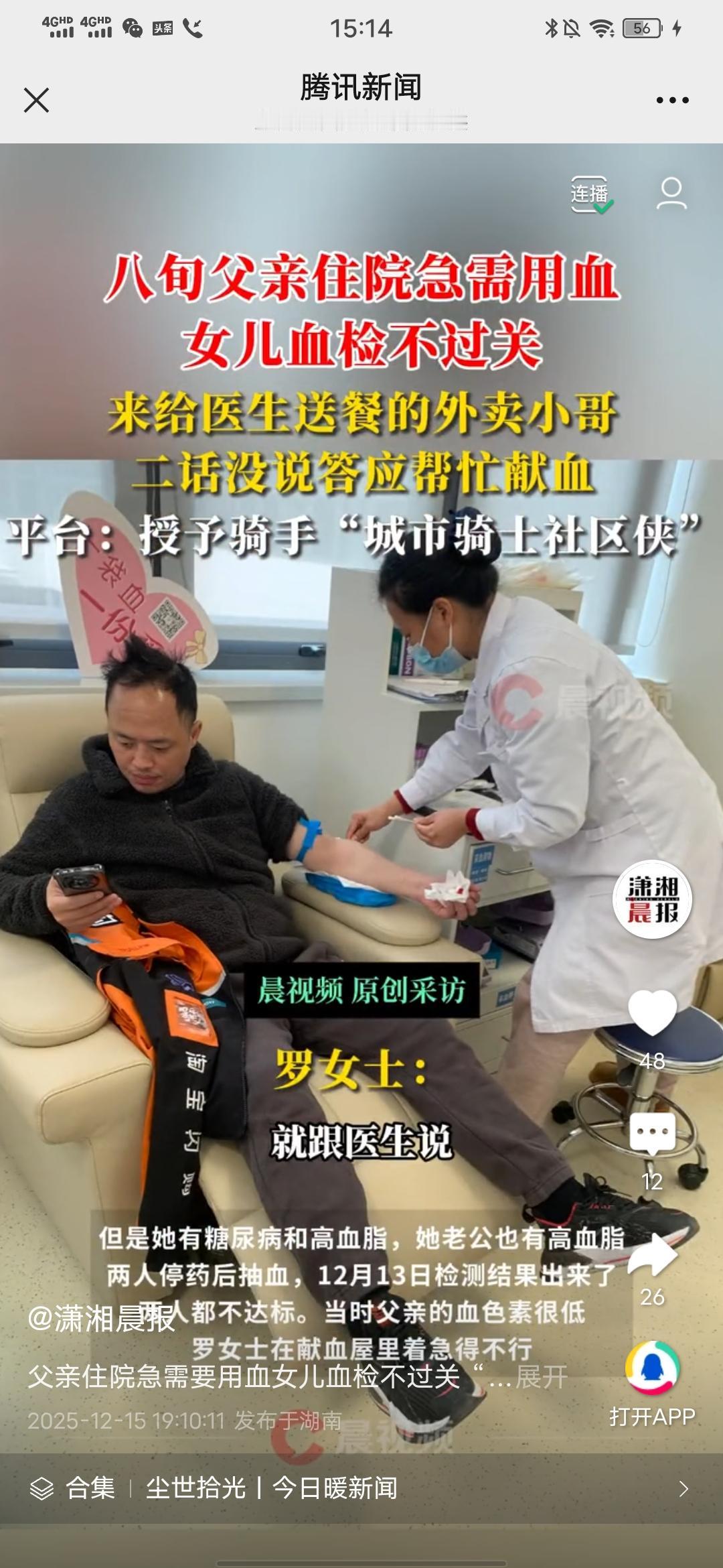 父亲住院急需要用血女儿血检不过关“走投无路”,给医生送餐的外卖小哥:抽我的! 这是潇湘晨报发布的消息,是当事人广西桂林的罗女士自己联系平台告诉记者的,事情是这样的,罗女士82岁的父亲,生病住院,父亲查出有贫血,急需输血,罗女士把家人都叫来医院了,但是自己和丈夫都因为血糖和血脂问题,检测出来不过关,无法献给自己父亲。 当时罗女士在献血屋急得像热锅上的蚂蚁,这时刚好有一位外卖小哥给献血屋的医生送餐,有点“疏离型人格”的罗女士,为了救父亲,什么都顾不上了,居然逮着人就问,所以就把事情给刚好来送餐的外卖小哥说了,请他能帮忙。结果,小哥听完,确认她父亲就在这家医院住院后,二话不说就答应给献血了。 罗女士心里非常感激,就说想看看小哥手机,然后偷偷加了小哥微信,并发了个红包,再替小哥收了,小哥知道后,坚决把红包退给了罗女士,他说他只是想帮忙,又不是卖这个的,罗女士这样搞得像交易似的,让人心里不好过,拗不过的罗女士又再想办法,说自己家孩子想送外卖,从小哥这里套出了队长电话,然后联系了队长,队长说会汇报到站点,后来平台给了小哥“城市骑士社区侠”的称号,罗女士还在淘宝做了锦旗,打算送过去。 这真的是一件很美好的事,为这里的外卖小哥点赞,好样的,祝愿好人一生平安!