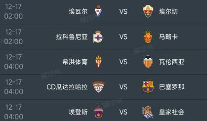 北京时间12月17日,明天西班牙国王杯迎来第三轮的较量: 第一场02:00,埃瓦尔(西乙第20名)PK埃尔切(西甲暂列第11名) 第二场02:00,拉科卢尼亚(西乙第2)PK马略卡(西甲第14) 第三场04:00,希洪体育(西乙第7)PK瓦伦西亚(西甲第17名) 第四场04:00,CD瓜达拉哈拉(西协甲A组)PK巴萨(西甲第一,也是卫冕冠军) 第五场04:00,埃登斯(西协甲B组)PK皇家社会(西甲第15名)
