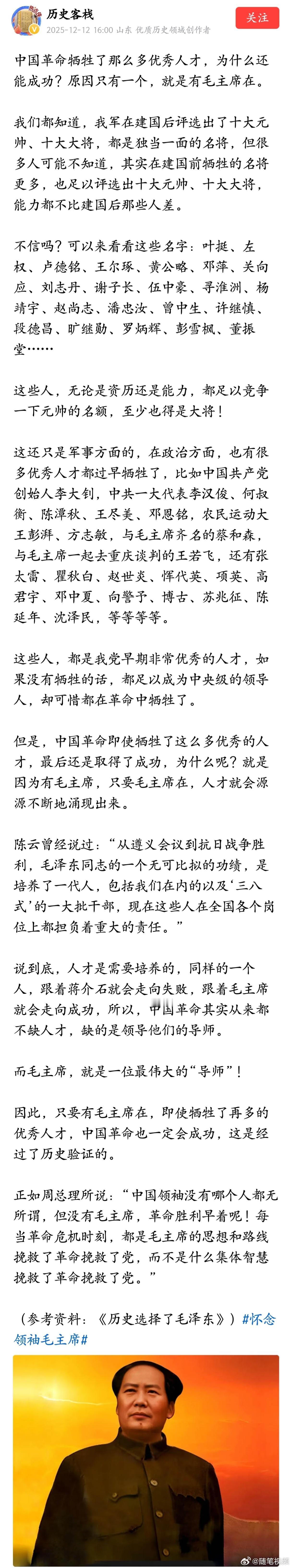 中国革命牺牲了那么多优秀人才,为什么还能成功?原因只有一个,就是有毛主席在。