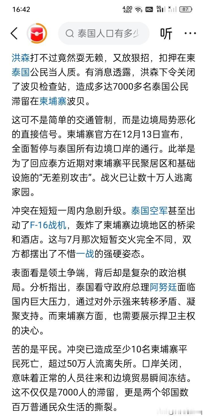 自作孽? 柬埔寨似乎在12月13日下令关闭波贝检查站,禁止7000多名泰国平民人员回国,让他们滞留在柬埔寨的波贝地区,以期达到限制泰国武装力量对柬埔寨的攻击。 估计任何人对扣留平民的行为,都可能会拍案而起,怒不可遏,只会增加武力攻击,施加更大的压力,而不会收敛武力,委屈求全。与此同时,军方大概也不会对这7000多平民的生命和生活担忧。 而且,柬埔寨的家族老大洪森扣留7000多名平民,还是负责他们的衣食往行,或者是有计划准备将这7000多名平民怎么样?可能这两种情况都做不到和不敢做,很可能到最后反而成了烫手的一大堆山芋。