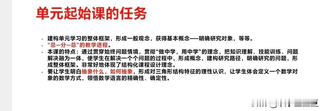 有点孤陋寡闻了,单元起始课?又是什么教育新名词?赶紧学习起来,不然就跟不上课改的节奏了。 单元起始课并非简单的“单元导入课”,而是数学单元教学的逻辑起点与框架基石,是衔接学生已有认知与单元新知识的关键桥梁,其核心价值在于为学生搭建知识的“认知地图”,让碎片化的知识点成为有逻辑、有体系的知识网络。 一、本质:从“零散学习”到“整体建构”的思维转型 单元起始课的本质是“先行组织者”的教学实践,打破传统“一课一知识点”的碎片化教学模式: 1. 定位上,它不是教授具体的知识点,而是明确单元的研究对象、研究路径与研究方法。 2. 思维上,它引导学生从“被动接受知识”转向“主动规划学习”,通过建立单元整体框架,让学生知道“学什么、为什么学、怎么学”,体现数学学习的系统性与探究性。 3. 逻辑上,它遵循数学知识“发生—发展—应用”的自然脉络,呼应教材“概念—性质—结构—应用”的单元结构,是数学学科本质在教学中的具象化。 二、核心价值:为教与学筑牢“双基”框架 单元起始课的价值体现在教师教学与学生学习两个维度,且直接决定单元教学的整体效率: 1. 对教师:明确单元教学的逻辑主线与重难点,避免教学过程中偏离核心、碎片化讲解,让教学设计更具整体性与针对性;同时依托“总—分—总”的进程,让教学环节更贴合知识的内在逻辑。 2. 对学生: 搭建认知框架:通过明确研究对象和路径,学生能预判单元知识的发展方向,减少学习的盲目性; 培养数学思维:在“做中学、用中学”的情境中,学生经历从具体到抽象的过程,掌握数学对象的研究方法(如抽象、归纳、演绎),而非仅记忆结论; 提升自主学习能力:整体框架让学生能自主规划学习节奏,主动将新知识点纳入已有体系,形成系统的知识结构。 三、实施核心:三大关键任务的落地 单元起始课的任务并非“面面俱到”,而是聚焦三个核心点,确保教学不流于形式: 1. 建构整体框架:通过问题情境或生活实例,引导学生梳理单元的核心概念、研究维度与逻辑关系,形成对单元知识的宏观认知。 2. 渗透研究方法:让学生体会数学研究的“基本套路”,比如研究几何图形的“定义→性质→判定→应用”,研究代数概念的“概念→运算→性质→应用”,实现方法的迁移与普适。 3. 激发探究动机:通过贯穿始终的问题情境,让学生在解决实际问题的过程中,感受到单元知识的应用价值,同时产生对具体知识点的探究兴趣,避免起始课的“空泛化”。 简言之,单元起始课是数学单元教学的“总开关”,其质量直接影响学生对单元知识的理解深度与思维高度,核心是让学生从“学知识”走向“会学知识”,真正体现数学教学的整体性与思维性。