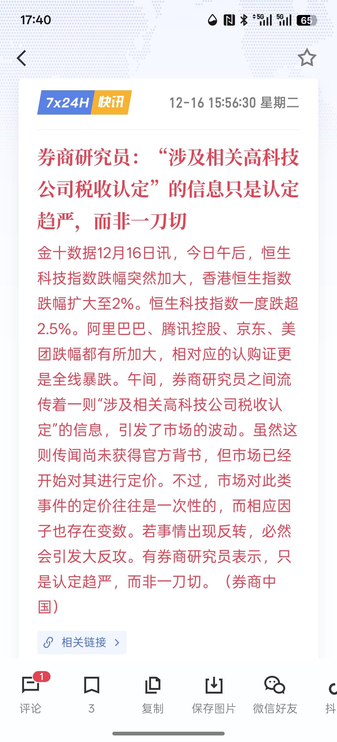今天整个科技板块大跌,就为了这一则消息,券商研究员:“涉及相关高科技公司税收认定”的信息只是认定趋严,而非一刀切,今天整个科技板块都出现了大幅度的下跌,包括A股的科技类公司,半导体公司以及港股的科技类公司,整体都出现了较大幅度的下跌! 首先,涉及到相关高科技公司税收认定,这到底是什么原因?也没有讲明白!所以不明不白的导致市场下跌!难道是小作文?在官方没有发布类似的消息!而且这样的消息就这么流传出来了,晚上也没有看到相关部门对这则消息证实!