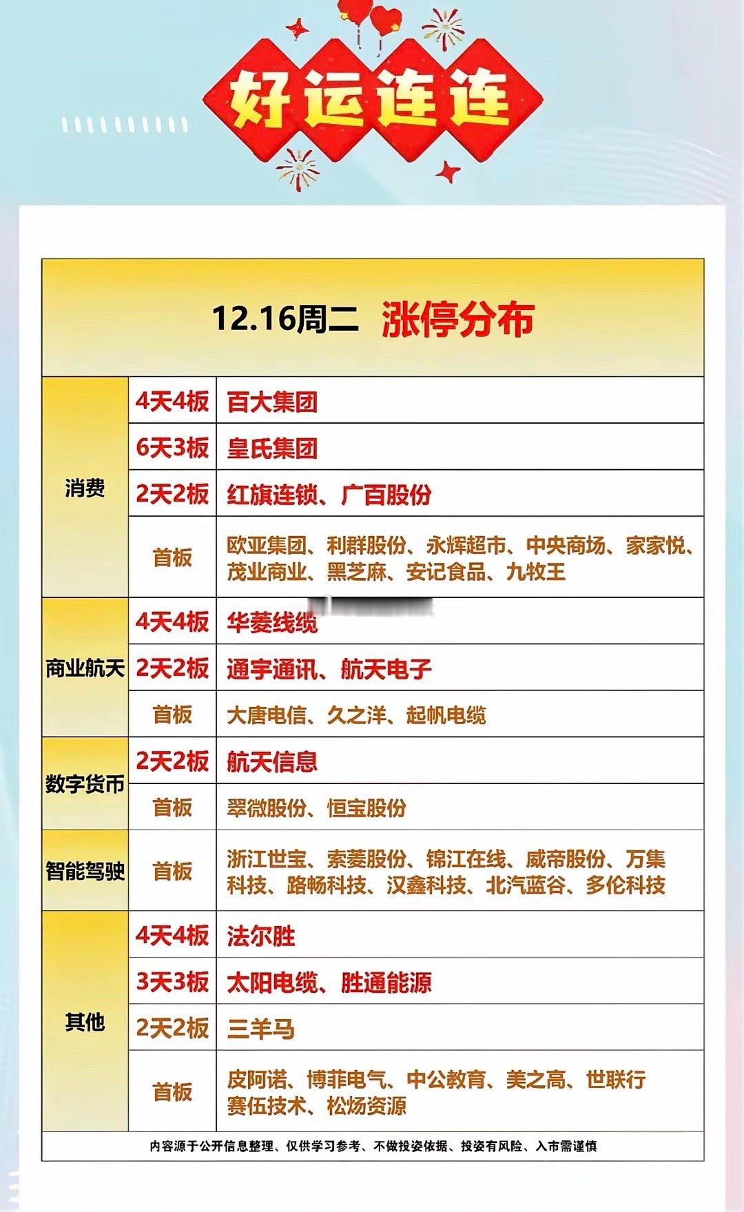 12.16周二 涨停板股票:题材+高度!涨停46家,跌停36家上涨1091家,下跌4302家1.大消费 13股涨停2.商业航天 6股涨停3.无人驾驶 9股涨停4.数字货币 3股涨停