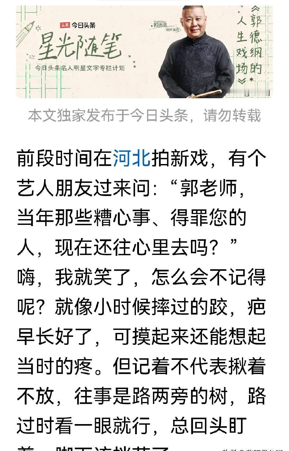你疤痕长好了,不等于你没摔过那个跤。 这是郭德纲的原话。 小时候摔的疤,肉长平了,但你知道那儿发生过什么。 记忆本身就是存在证明。 现在他管这叫“路旁的树”。 当年挡你道的、硌你脚的,都成了风景。 他甚至觉得亲切:要是没那几棵树杵在那儿,你早拐弯了,哪会闷着头把这条道走通? 记着,是为了校准方向。 不是背着上路。 别纠结于该记着还是忘了。 要问它把你推向了哪条更远的道。