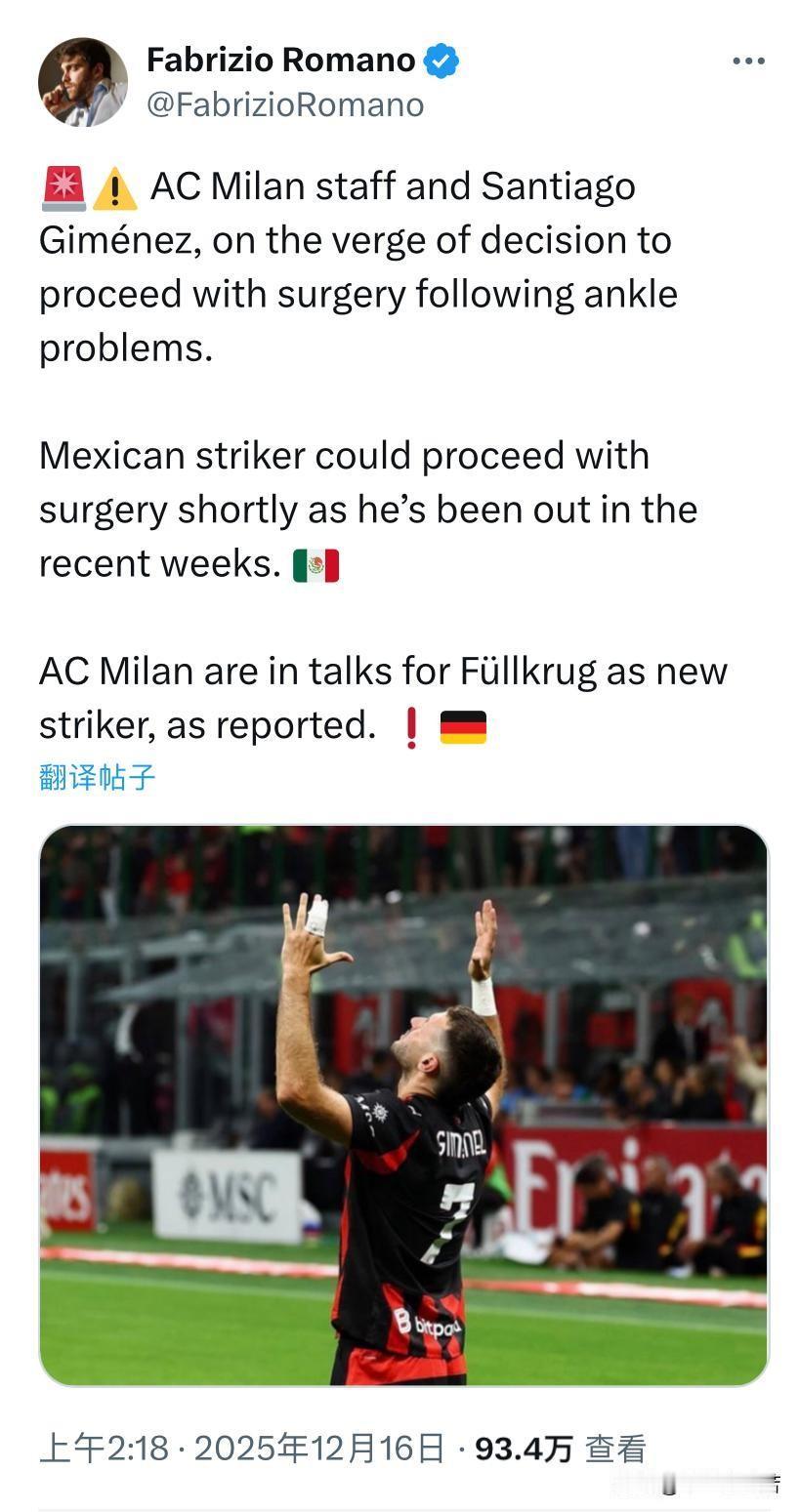 希门尼斯真的一言难尽!罗马诺消息称圣地亚哥·希门尼斯即将决定是否进行脚踝手术。这