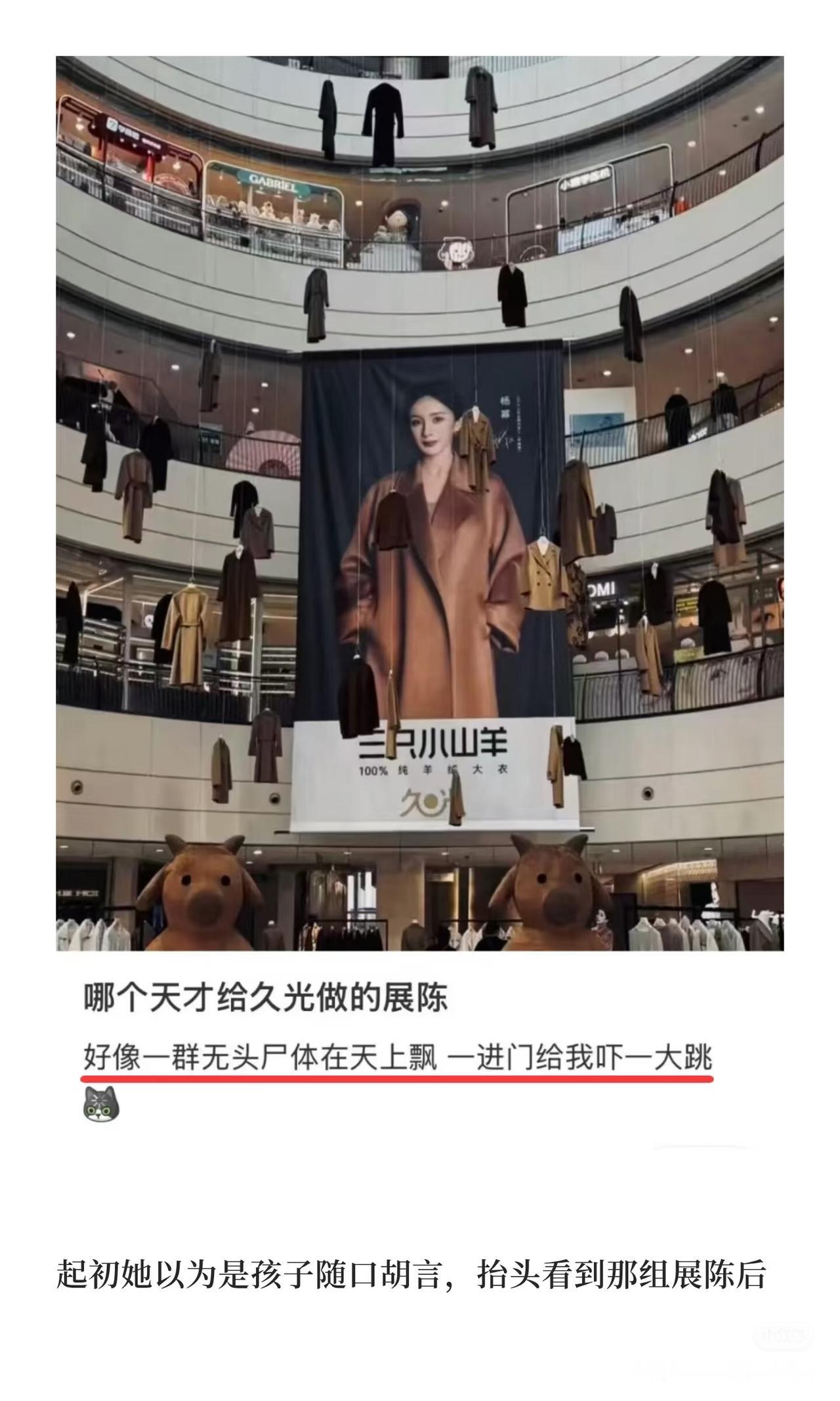 事出反常必有妖! 上海久光百货这“悬衣阵”是来劝退顾客的吧? 三只小山羊品牌把数十件万元大衣悬空乱挂,中间还摆着杨幂海报,网友看了直呼像“无头人影飘着”,商场被投诉到连夜撤展。 营销想玩创意没问题,但连大众忌讳都不顾,纯属搬起石头砸自己脚。 品牌想博眼球也得有底线,违背审美和民俗的“惊悚营销”,只会让高价商品更掉价。 这品牌方的营销团队估计要被炒鱿鱼了吧!