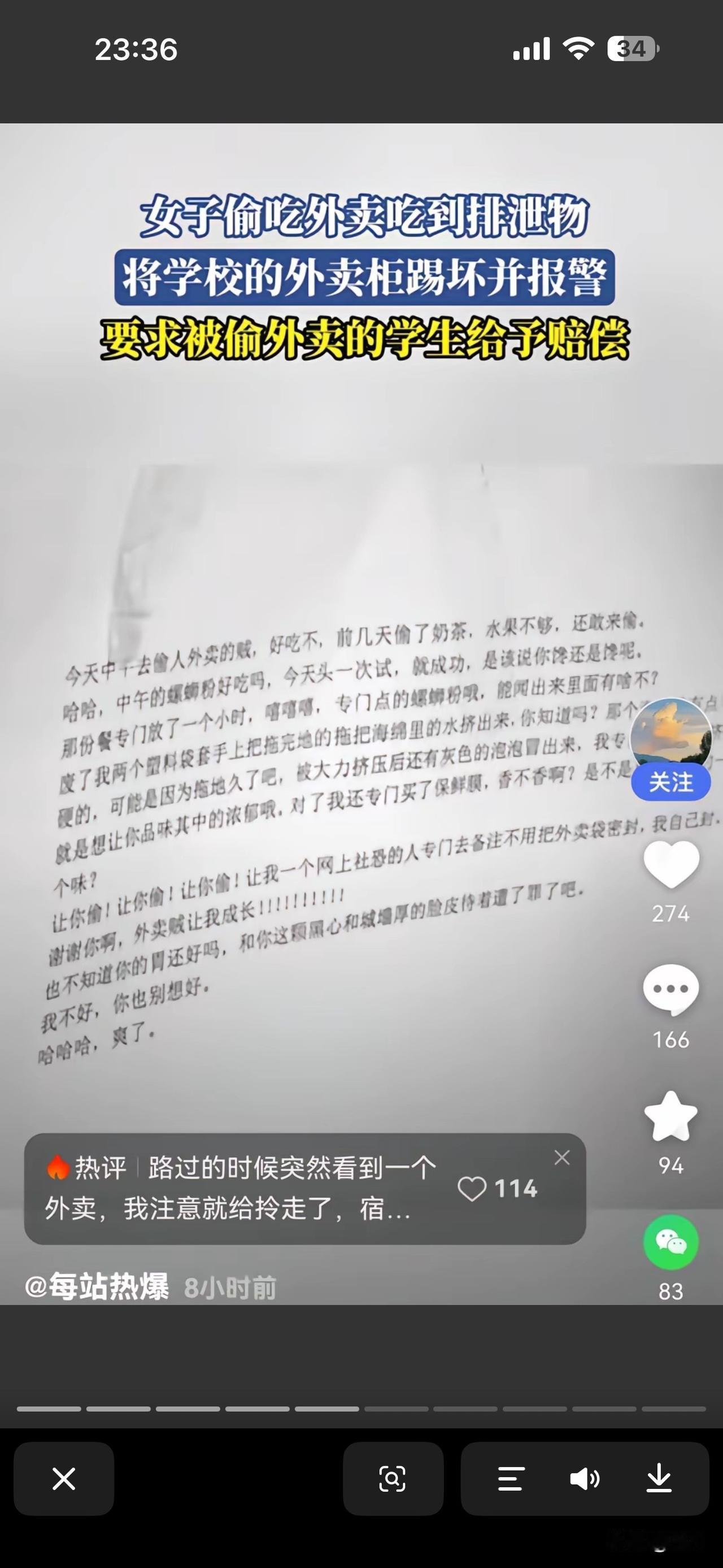 女子偷吃外卖吃到排泄物,向外卖柜发泄怒火 近期某高校女生多次偷盗外卖,近期误食含“排泄物”的外卖后,反控诉受害者并要求赔偿。 针对此事,大家怎么看?