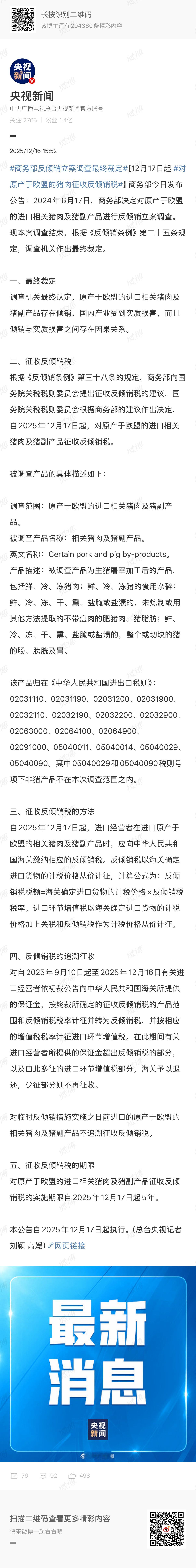 🔻欧盟几个农业国和猪肉出口国:寄。商务部反倾销立案调查最终裁定热点现场海外新鲜事