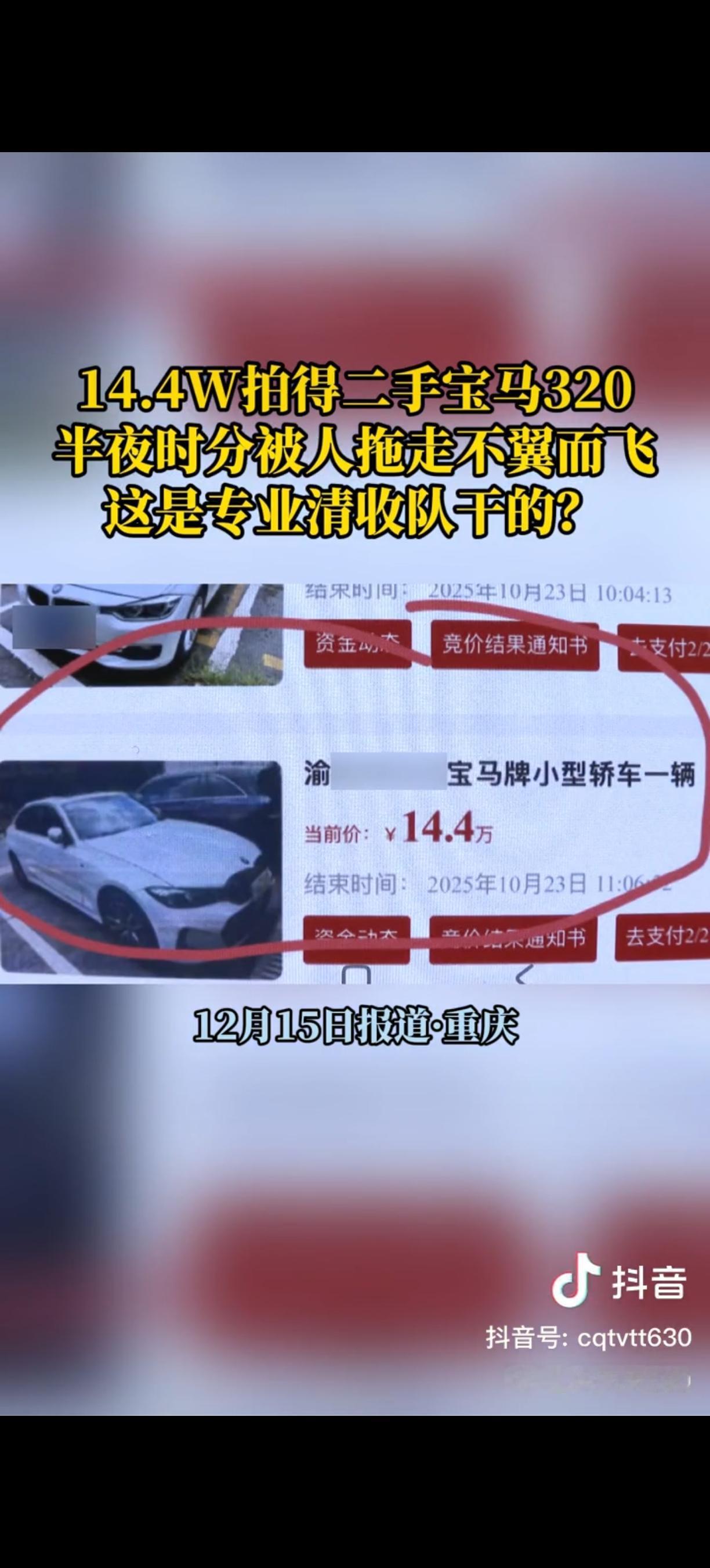 “亏大发了!”重庆,一男子在法院竞拍下,花14.4万拍下一辆2023年的宝马320。谁知,车子到手后,还没等顺利过户呢,车子就在停车场不翼而飞。男子调取监控发现,4个陌生人开来一辆皮卡,将自己的车子拖走了。男子怀疑原车主有外债,肯定知道实情,于是,找到原车主询问情况,可原车主一口咬定,这事和他无关。男子只能报警,目前,警方已经介入。 这位男子是黄先生,他在今年十月底,于法院诉讼资产网站上看到这台2023年的白色宝马320,以14.4万元的价格竞拍成功。 办完相关手续后,11月11日,法院下达了执行裁定书和协助执行通知书,判定车辆归他所有的公司所有。 之后,黄先生喊板车将车拖回,因车辆无钥匙,他又联系4S店补配钥匙,这一等又是十几天。上周,他准备好所有资料去车管所办理过户,总共需办补行驶证、解押、提前免检、处理违章、过户五项业务,可因时间关系,只完成了前两项,便约好周一再办。 他将车停在二手车行停车场后回家过周末,周日晚上返回时发现车辆不见。调取监控看到,十四号凌晨十二点过,一辆无牌皮卡载着四人,仅用几分钟就把车拖走了。 黄先生怀疑是原车主的专业清收队所为,因为原车主可能和第三方有债务关系。可他找到原车主沟通,对方却称自己外面没有债务,也不知道这事。 无奈之下,黄先生报了警。警方查询监控后,发现车辆最后出现在往弹子石方向的余杭大道,之后便没了踪迹。目前,警方仍在进一步调查中,黄先生也在焦急等待着消息,希望能尽快找回车辆,挽回自己的损失。 在这件事里,黄先生的遭遇确实让人揪心。法院竞拍本是正规途径,可没想到还会遇到这样的糟心事。这也提醒我们,即使通过正规渠道交易,也要留意交易标的的历史纠纷,尽可能把风险排查清楚。同时,也希望警方能尽快破案,给黄先生一个交代,让违法者受到应有的惩处。 各位读者你们怎么看?欢迎在评论区讨论。 来源:重庆天天630 2025-12-15报道