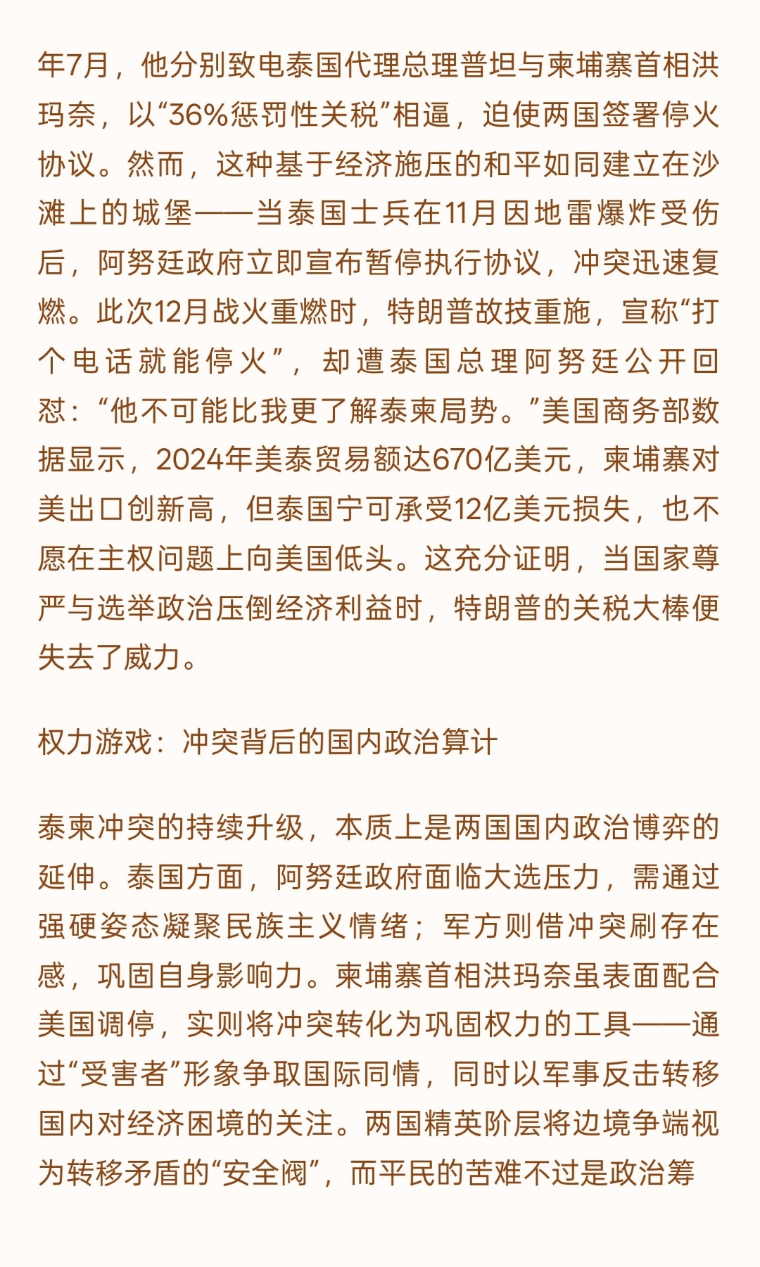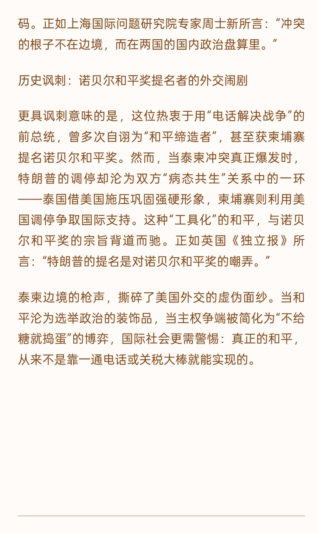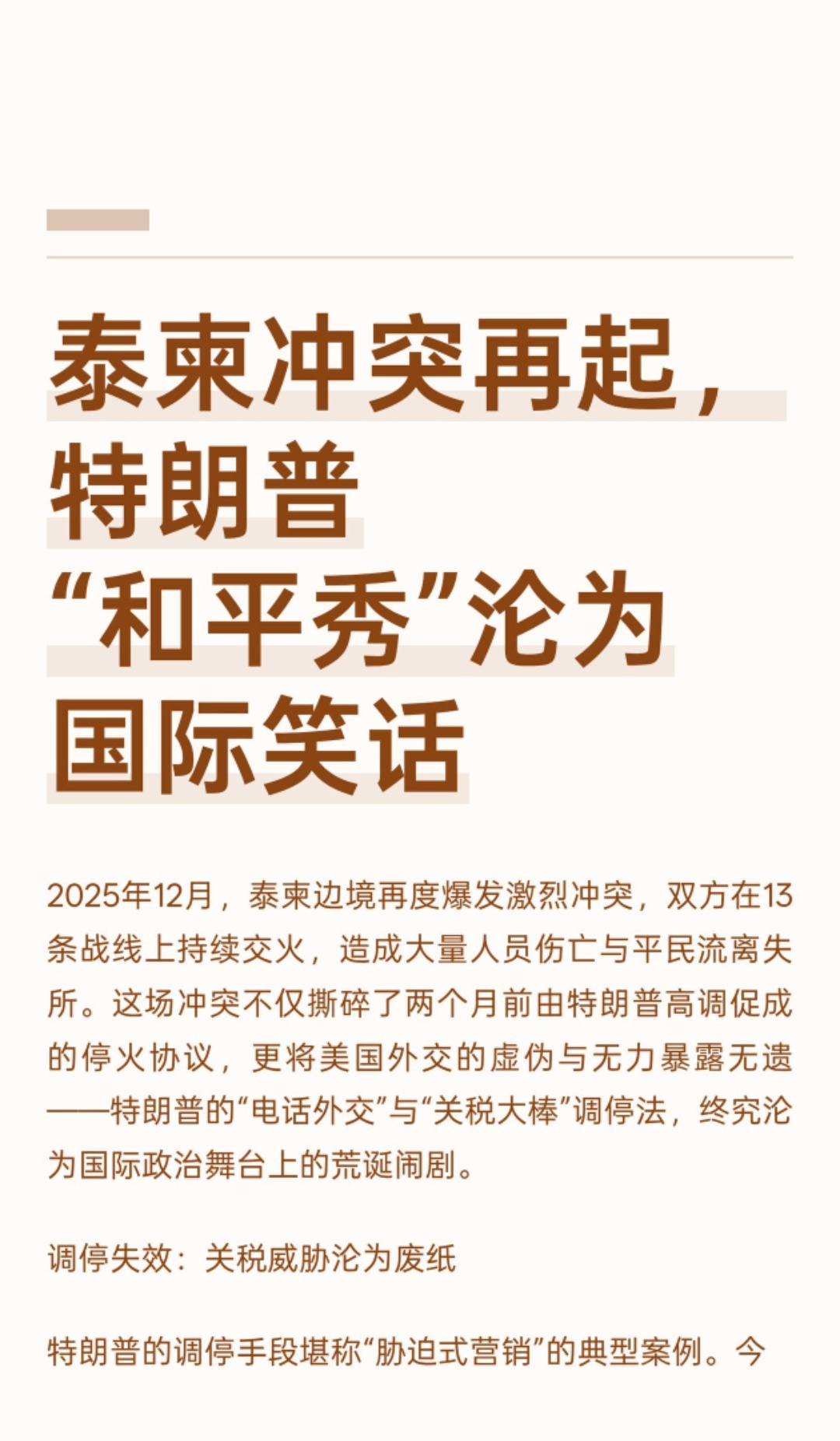 | 2025年12月,泰柬边境再度爆发激烈冲突,双方在13条战线上持续交火,造成大量人员伤亡与平民流离失所。这场冲突不仅撕碎了两个月前由特朗普高调促成的停火协议,更将美国外交的虚伪与无力暴露无遗——特朗普的“电话外交”与“关税大棒”调停法,终究沦为国际政治舞台上的荒诞闹剧。特朗普的调停手段堪称“胁迫式营销”的典型案例。今年7月,他分别致电泰国代理总理普坦与柬埔寨首相洪玛奈,以“36%惩罚性关税”相逼,迫使两国签署停火协议。然而,这种基于经济施压的和平如同建立在沙滩上的城堡——当泰国士兵在11月因地雷爆炸受伤后,阿努廷政府立即宣布暂停执行协议,冲突迅速复燃。此次12月战火重燃时,特朗普故技重施,宣称“打个电话就能停火”,却遭泰国总理阿努廷公开回怼:“他不可能比我更了解泰柬局势。”美国商务部数据显示,2024年美泰贸易额达670亿美元,柬埔寨对美出口创新高,但泰国宁可承受12亿美元损失,也不愿在主权问题上向美国低头。这充分证明,当国家尊严与选举政治压倒经济利益时,特朗普的关税大棒便失去了威力。泰柬冲突的持续升级,本质上是两国国内政治博弈的延伸。泰国方面,阿努廷政府面临大选压力,需通过强硬姿态凝聚民族主义情绪;军方则借冲突刷存在感,巩固自身影响力。柬埔寨首相洪玛奈虽表面配合美国调停,实则将冲突转化为巩固权力的工具——通过“受害者”形象争取国际同情,同时以军事反击转移国内对经济困境的关注。两国精英阶层将边境争端视为转移矛盾的“安全阀”,而平民的苦难不过是政治筹码。正如上海国际问题研究院专家周士新所言:“冲突的根子不在边境,而在两国的国内政治盘算里。”更具讽刺意味的是,这位热衷于用“电话解决战争”的前总统,曾多次自诩为“和平缔造者”,甚至获柬埔寨提名诺贝尔和平奖。然而,当泰柬冲突真正爆发时,特朗普的调停却沦为双方“病态共生”关系中的一环——泰国借美国施压巩固强硬形象,柬埔寨则利用美国调停争取国际支持。这种“工具化”的和平,与诺贝尔和平奖的宗旨背道而驰。正如英国《独立报》所言:“特朗普的提名是对诺贝尔和平奖的嘲弄。”泰柬边境的枪声,撕碎了美国外交的虚伪面纱。当和平沦为选举政治的装饰品,当主权争端被简化为“不给糖就捣蛋”的博弈,国际社会更需警惕:真正的和平,从来不是靠一通电话或关税大棒就能实现的。