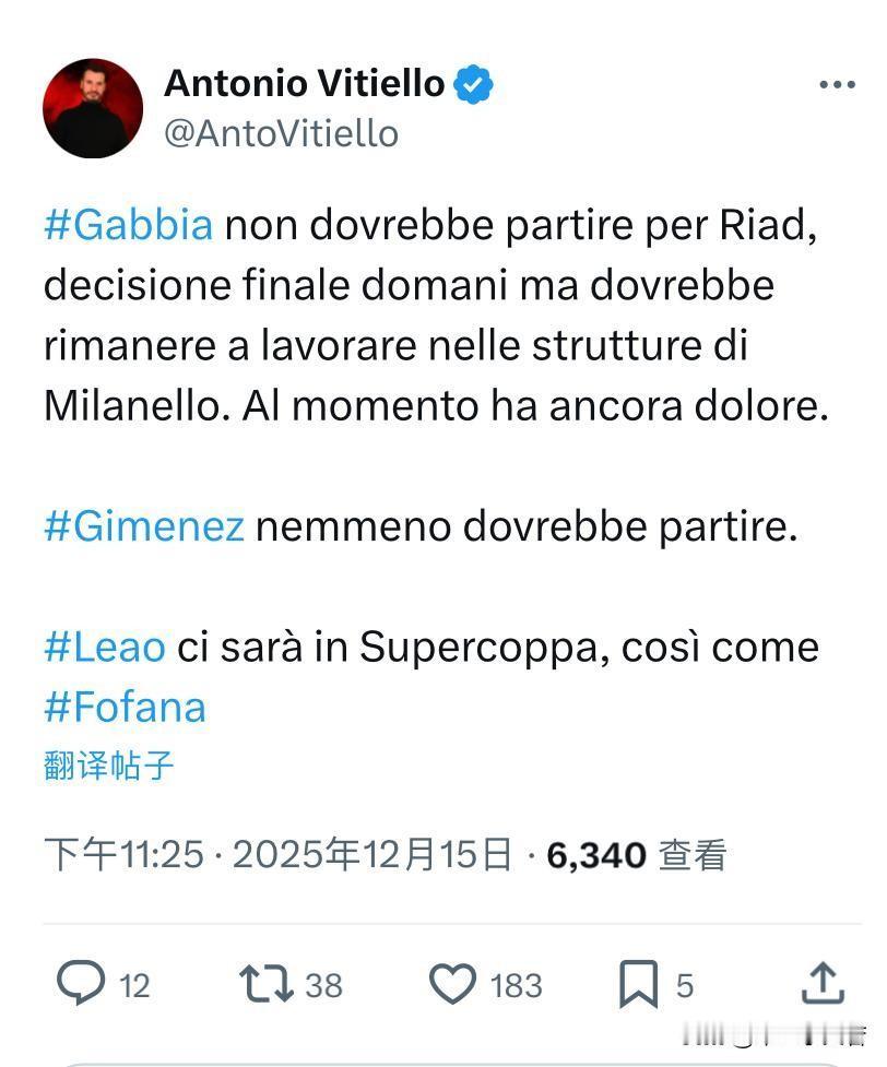 加比亚!加比亚不会前往利雅得参加意大利超级杯。维蒂耶洛消息称虽然加比亚自己还没有最后决定,但他很可能会被留在米兰内洛,阿莱格里不希望加比亚冒险。同时缺席意大利超级杯的球员还有希门尼斯,他的伤病貌似更加严重,而之前对萨索洛缺席的莱奥与福法纳将随球队前往利雅得参加意大利超级杯。 据说阿莱格里对于球队前往利雅得参加意大利超级杯十分不满,他认为这样球队会很疲劳,同时状态也会收到一定的影响,他对于这样的安排十分不满,对于意大利超级杯阿莱格里并不重视。之前觉得阿莱格里想在超级杯有所表现,现在看阿莱格里本赛季貌似只是想联赛有个理想的排名,超级杯阿莱格里确实不感冒。 个人觉得阿莱格里肯定是不重视意大利超级杯,如果阿莱格里想在超级杯有所作为不可能不带着加比亚,帕夫洛维奇和托莫里都很出色,但都是莽夫,没有加比亚指挥后防,看看对萨索洛,两个莽夫组合下后防线瞬间就混乱了。