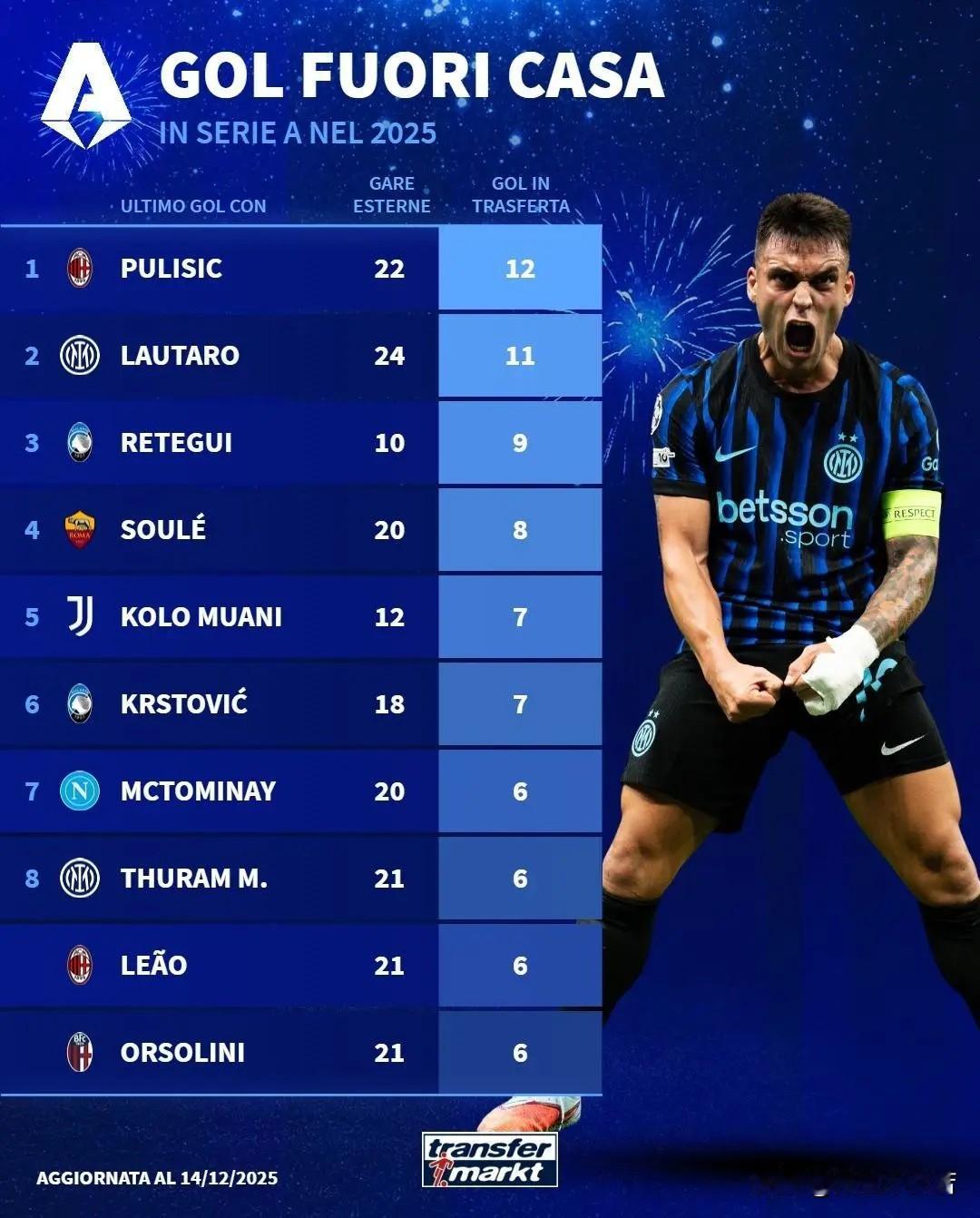 普利西奇!意甲联赛2025年客场进球最多的球员为普利西奇!看了半天我也没理解,普