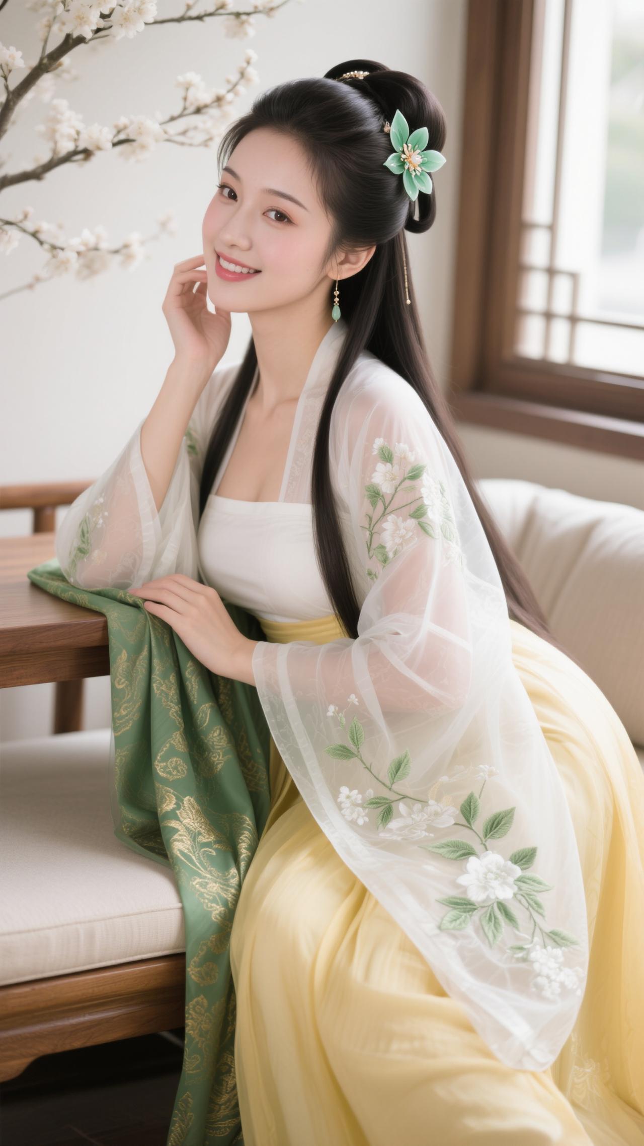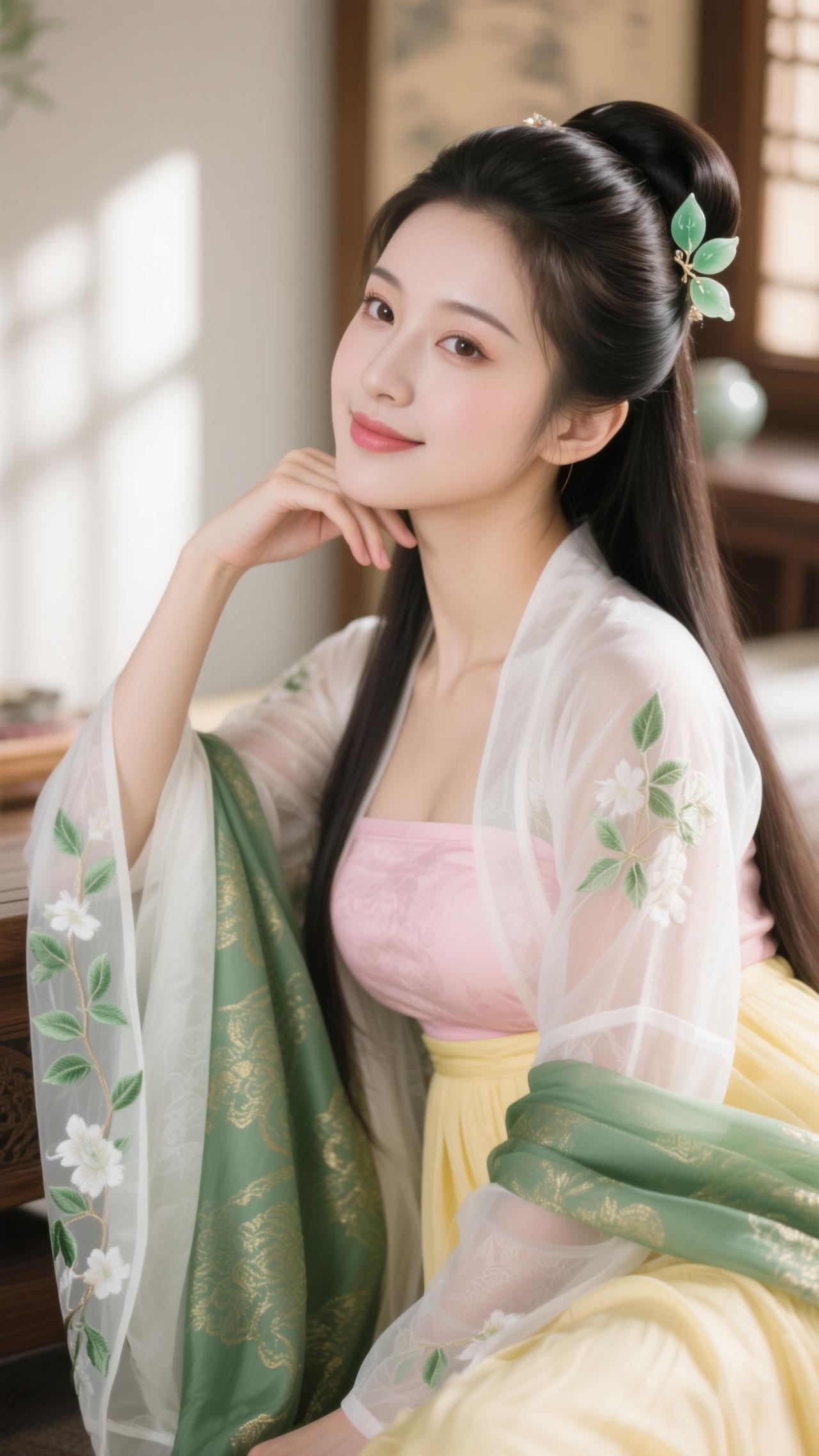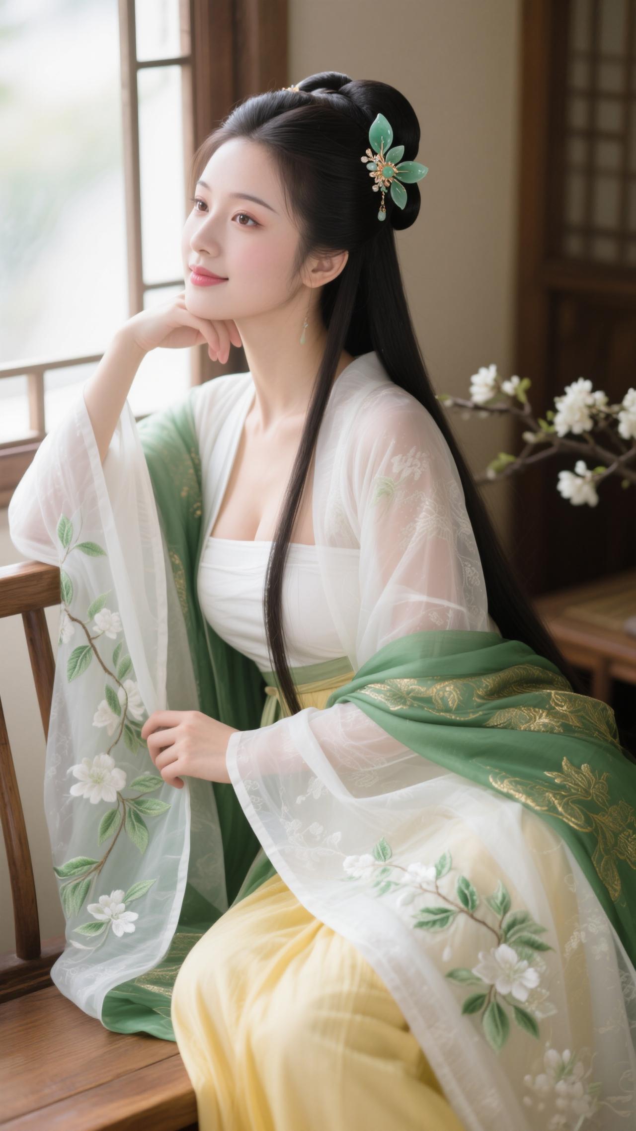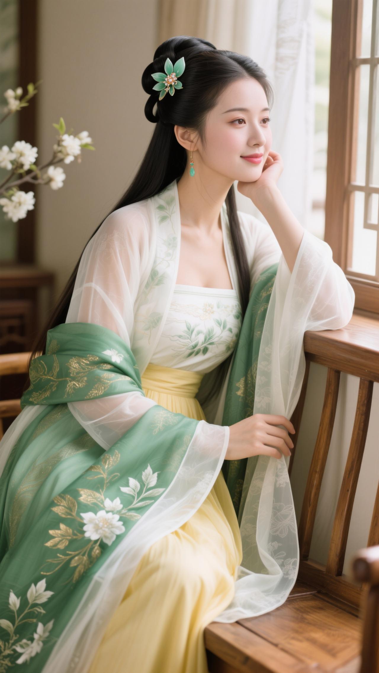 《阮郎归·闺中闲思》 白纱轻覆绿罗裳,簪花凝晓光。 粉黄裙裾衬春妆,眉弯笑靥扬。 腮托手,意徜徉,晴窗落影长。 一襟风软惹花香,闲愁付暖阳。