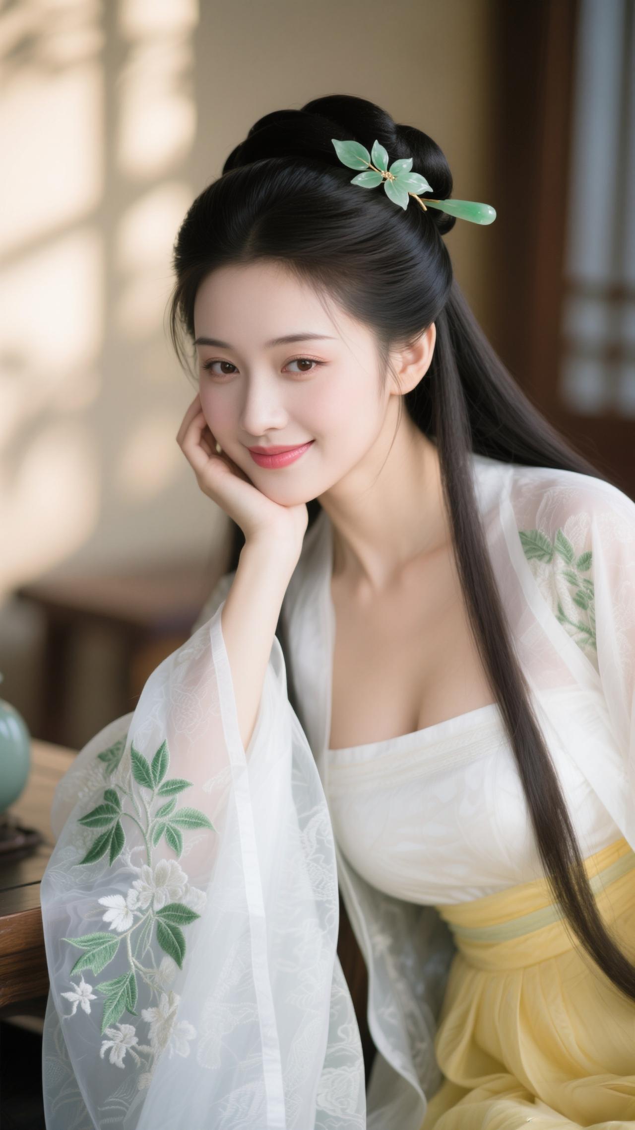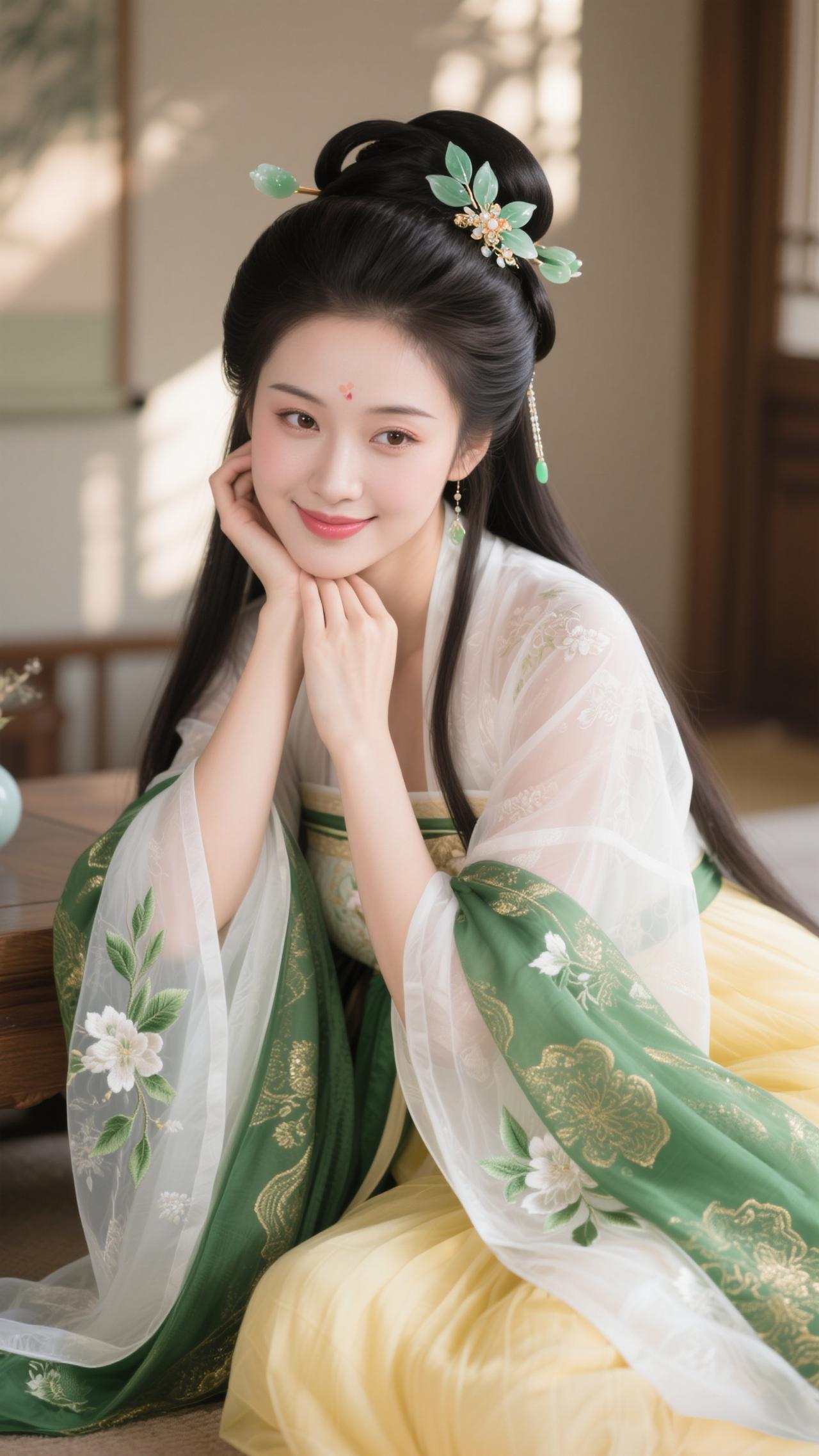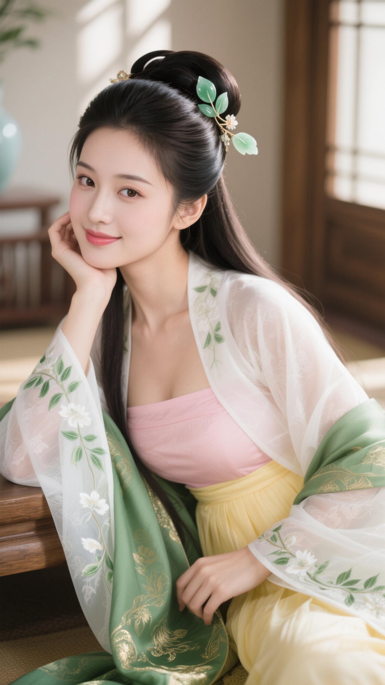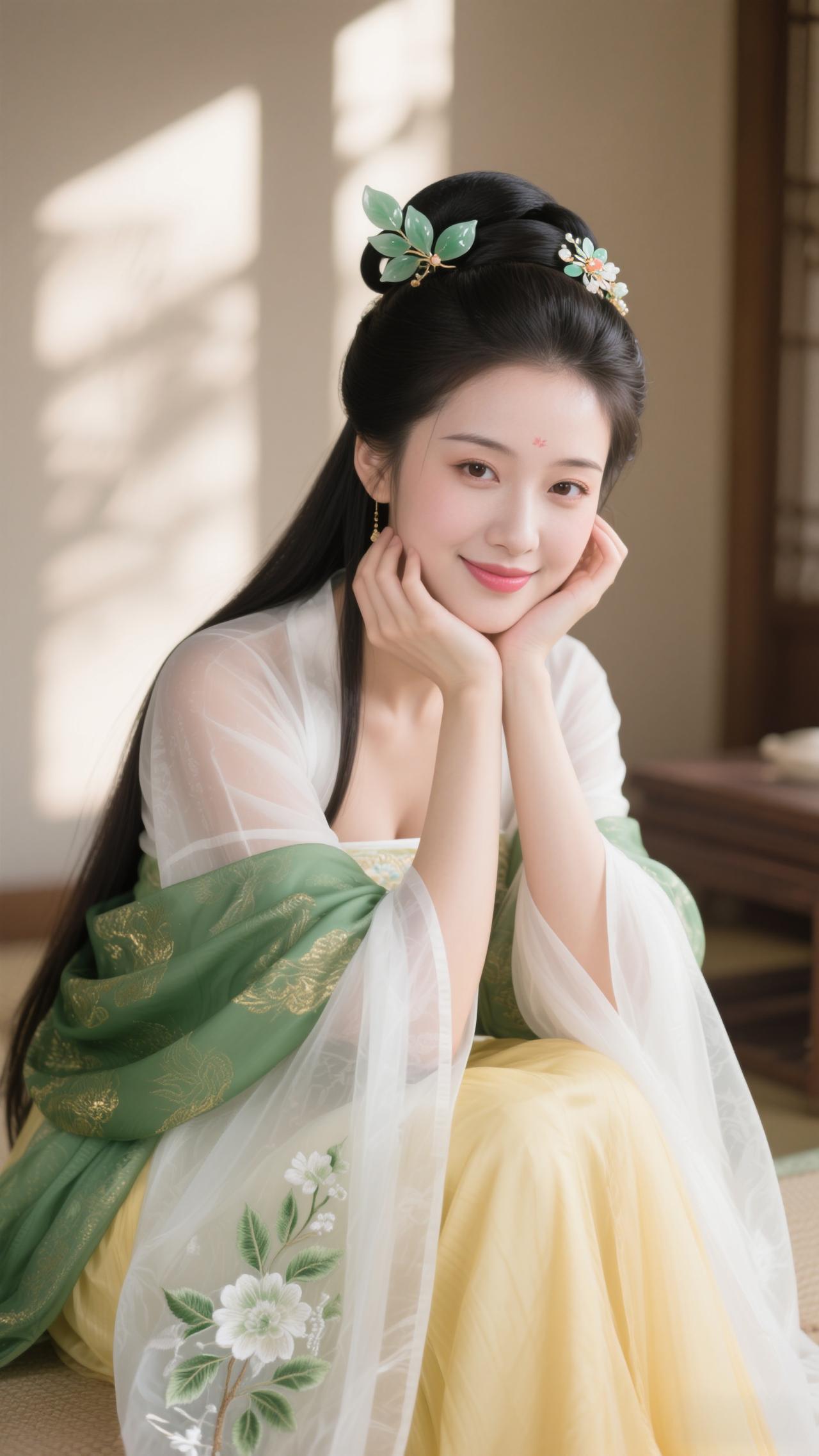 《阮郎归·闺中闲思》 白纱轻覆绿罗裳,簪花凝晓光。 粉黄裙裾衬春妆,眉弯笑靥扬。 腮托手,意徜徉,晴窗落影长。 一襟风软惹花香,闲愁付暖阳。