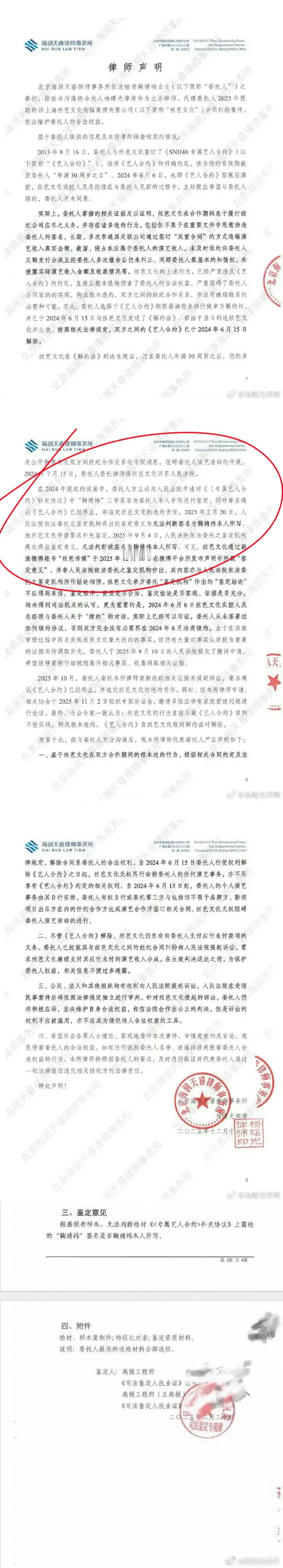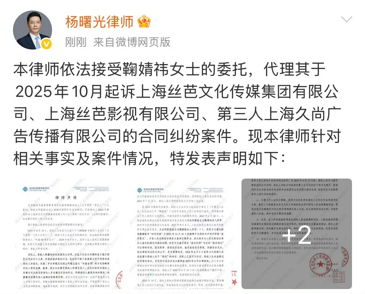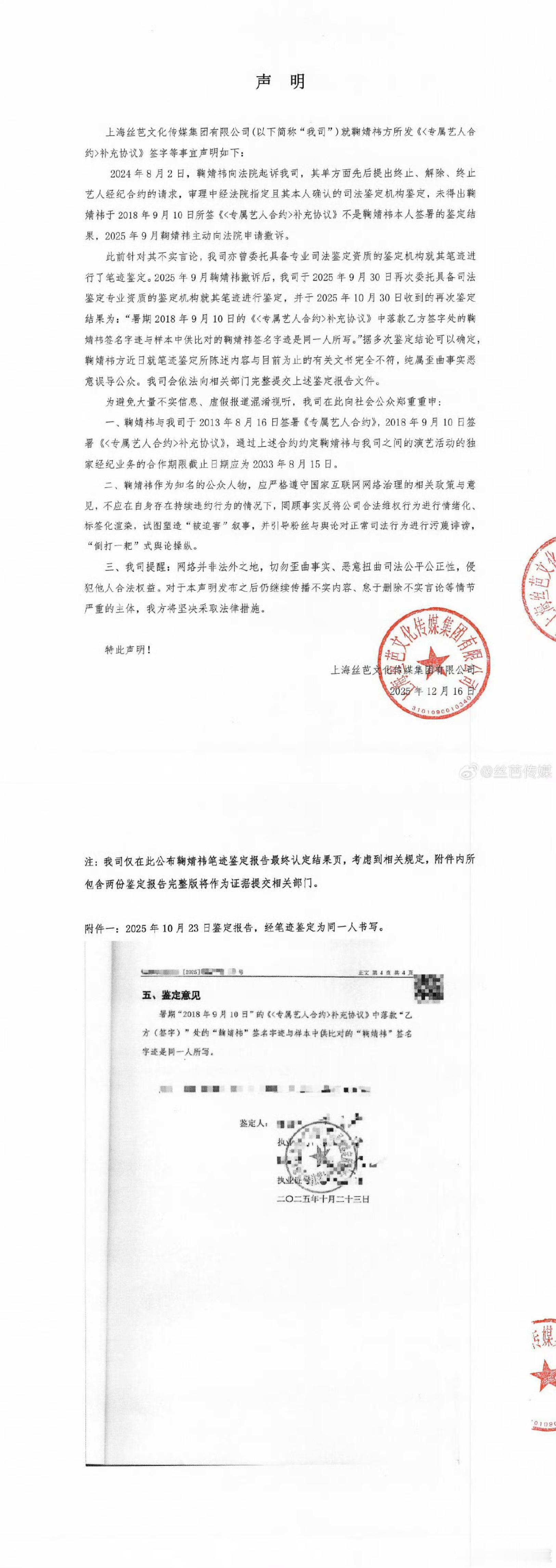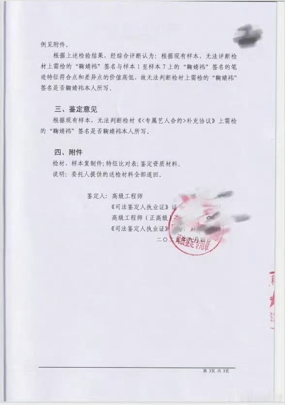 丝芭声明:补充协议的签名鉴定结果为鞠婧祎的签名字迹与其样本字迹是同一人。鞠婧祎方律师:否认补充协议签名为本人手写,根据人民法院委托的鉴定机构得出的结果为无法判断签名为鞠婧祎本人所写。丝芭回应鞠婧祎