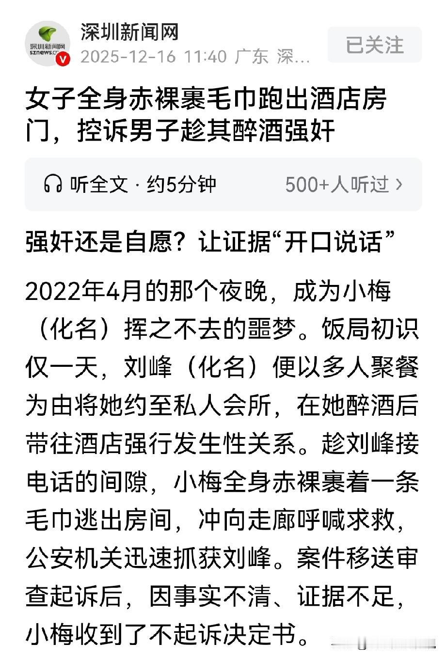 广东中山,一女孩和认识2天的男子聚餐,醉酒后,被男子带到酒店强行发生关系,事后,女孩趁男子接电话,赤 裸 身体裹一条毛巾逃出。男子被抓后称:双方自愿,女孩带套子和润滑剂前往房间,并自行使用,因女孩索要10万未果后报警。万万没想到,案子因事实不清、证据不足,女孩收到不被起诉决定书,女孩不服,向检察院提起申诉,而最终结局,令人意想不到。 2022年4月,小梅参加一个饭局,认识了一个叫刘峰的男子。 刘峰一眼就相中了年轻美貌的小梅。 本来两人只有一面之交,但第二天,刘峰就迫不及待的邀请小梅参加聚餐。 小梅想着聚餐现场人很多,安全没有问题,就接受了刘峰的邀请。 第二天,小梅如约来到位于某私人会所的聚餐地点。 现场气氛热烈,小梅不知不觉的就喝多了,并因醉酒意识不清。 刘峰一看时机到了,趁机将小梅带到了酒店开了一个房间,并强行和她发生了关系。 小梅酒醒后,意识到发生了不该发生的事,因害怕再次受到伤害,她不敢激怒对方。 后来趁刘峰接电话的机会,小梅衣服都没来得及穿,只拿了一条毛巾,裹在身上后逃出房间。 她冲到酒店的走廊大声求助,有房客救下小梅,并拨打报警电话。 刘峰被抓后,小梅本以为对方会受到应有的处罚。 然而,她万万没想到,她收到的竟然是一份“不起诉决定书”。 小梅绝望的大哭:刘峰明明在自己无意识的情况下做下了违法的事实,为什么不被追究刑事责任? 原来刘峰这人特别狡猾,被抓后,他反咬一口,称两人是亲密关系,双方自愿。 刘峰称,小梅自带套子和润滑剂前往酒店房间,自己脱衣服,并使用了润滑剂。 事后小梅反水,原因是她向自己索要10万块钱的报酬,自己没有答应,小梅报警。 因双方各有一套说辞,一时真假难辨,案件陷入僵局。 这起案件,最终因事实不清,证据不足而不被起诉。 小梅实在想不通,刘峰倒打一耙,自己却有口难辩! 在沉默了将近2年的时间后,小梅在2024年2月,向当地检察院提出申诉。 检察院本着,刑事申诉检察是司法纠错的最后一道防线,并很快成立了办案组。 检察官们不放过任何一个细节,在调查中发现,案件陷入僵局,是因为小梅称自己醉酒后被刘峰强 jian。 而刘峰辩称,双方自愿发生关系,因两人产生矛盾后小梅报警。 因为双方又各执一词,最终以事实不清、证据不足,本案被免于起诉。 既然双方各执一词,那就让客观证据说话,办案人员通过核实,终于从刘峰的口供中,发现2个问题。 1、刘峰称:小梅自带套子和润滑剂,并自行脱衣服使用,但办案人员却发现,抽屉里的两件物品根本没拆封。 2、刘峰称,和小梅关系亲密,通过调查发现,案发时两人是第二次见面。 之前并不认识,更谈不上有感情基础,且平时没有金钱来往,这些证据,足以证明刘峰说谎。 这次办案人员还破解了案件中,3个当初未得到证实的疑点。 1、刘峰却称2人并未发生关系,但从刘峰的隐 私部位提取到小梅的DNA。 而小梅对案件陈述的过程,与身体因抵御而产生的伤痕相吻合。 酒店走廊的视频画面记录了,小梅仅裹一条毛巾,神色慌张,向房客求助,符合受到侵害后,向他人求救的紧急反应。 2、案件最初,办案人员在套子上提取到小梅的DNA。 经过反复查看现场勘验录像,终于发现:勘察人员戴手套触碰了小梅的呕吐物。 因未更换手套,直接接触了套子的外包装,导致物证受到污染。 并因此推翻,小梅携带套子和润滑剂前往酒店的事实。 3、当年,本案中刘峰在酒店房间,通过打电话、发信息寻找小梅的那几句话:你去哪儿?几个意思? 就因为这两句话,被认定二人自愿发生关系,事后产生矛盾的合理怀疑。 这次检察官补充了证人证言证明,小梅逃出房间后,没来得及拿手机。 刘峰故意给小梅手机打电话、发信息,制造2人自愿的不实事实。 《刑法》第236条第一款:以暴力、胁迫或者其他手段强jian妇女的,处三3年以上10年以下有期徒刑。 上述条款,明确了强jian罪的基本构成要件和处罚范围。 刘峰趁小梅醉酒意识不清之际,将其带到酒店并与其发生性关系,属于利用小梅不知反抗、不能反抗的状态实施xing行为,符合“以其他手段强jian妇女”的情形,构成强j罪,应受到3年以上10年以下有期徒刑的刑事处罚。 刘峰被法院判处有期徒刑3年6个月,是依据该条款作出的判决。 《刑法》第236条第3款第1项:强J妇女、Jian y幼女,有下列情形之一的,处10年以上有期徒刑、无期徒刑或者死刑: (一)强J妇女,jian y幼女情节恶劣的。 虽然案例中未提及刘峰的行为,属于情节恶劣情形。 但条款本身体现了法律对严重强J犯罪行为的严惩态度,保护被害人权益,维护公序良俗。 最终,检察院撤销了不起诉的决定,指令原办案单位提起公诉。 2025年3月,法院以强奸罪判处刘峰有期徒刑3年6个月。