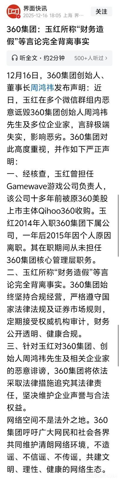 科技圈大瓜!前360高管炮轰周鸿祎,自称帮其做假账,周鸿祎回应来了:极端失实。 近日,前360高管玉红在朋友圈和多个微信群组内,公开曝料360集团创始人周鸿祎财务造假,涉及金额“几十个亿”? 360杀毒软件算得上国家的“脊梁骨”!对于电脑一族来说,更算是家喻户晓的一款软件。 以前,我也一直用的360杀毒软件,总觉得用起来比别的得心应手些。 今日突然被这条不知真假的消息刷屏了,网络上也炸开了锅! 对此,360集团创始人周鸿祎做出了以下三点回应。 1,2014年,玉红曾入职360集团下属公司,2015年因个人原因离职。 在职期间,玉红从未担任360集团核心管理层职务。 2,玉红所称的“财务造假”等言论完全背离事实。 360集团的财务向来公开透明、健康合规。 3,360集团将依法采取法律措施,追究其法律责任,坚决维护企业声誉与合法权益。 对于这件事,先听听网友们怎么说? 有网友认为:对方敢实名举报,就应该严查一下。如果真有问题,就必须受到法律制裁,如果没有问题,就还人家清白。 也有网友坦言:A股必须立新规,凡做假账,所有责任人都应担责。不管做假数字是多少,不管是公司高管,还是会计人员,只要在报表中签名,一律判刑,且终生行业禁入。 还有网友强调:双方各执一词,玉红并未拿出实锤证据,360也已经给出了严正的声明。在真相还没有彻底明朗之前,不信谣、不传谣,才是最正确的做法。 个人认为 果然林子大了,什么鸟都有! 作为亲自使用过360软件的来说,360对于国内来说,有着非凡的意义,绝不容许被诽谤。 公道自在人心,身正不怕影子斜。 只要一切合理合规,相信360一定不怕查,相关部门定会还它一个公道的! 消息来源于《界面快讯》 周鸿祎