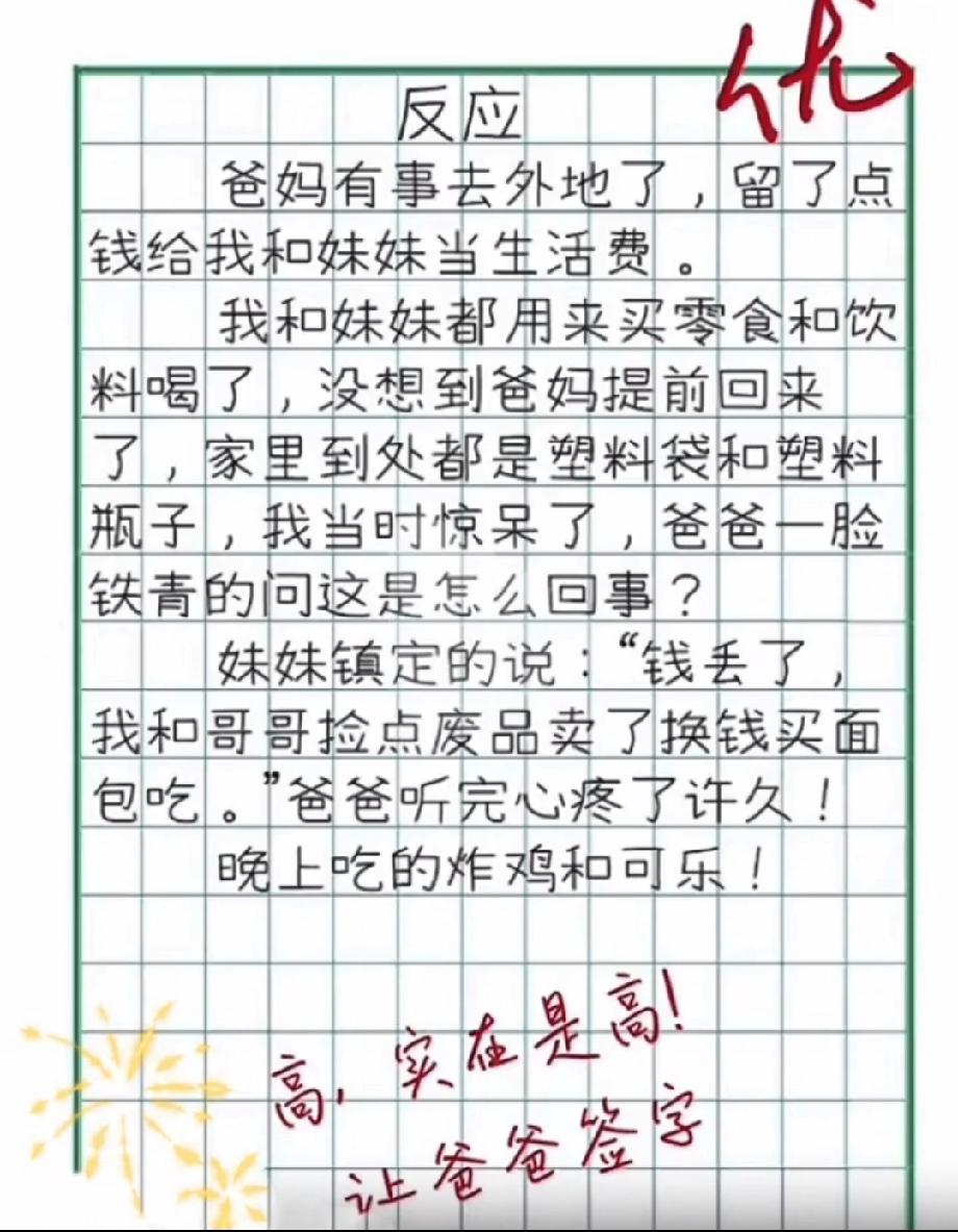 被这篇作文逗乐了!兄妹俩花光生活费,妹妹的机智回应让爸爸心疼又好笑!