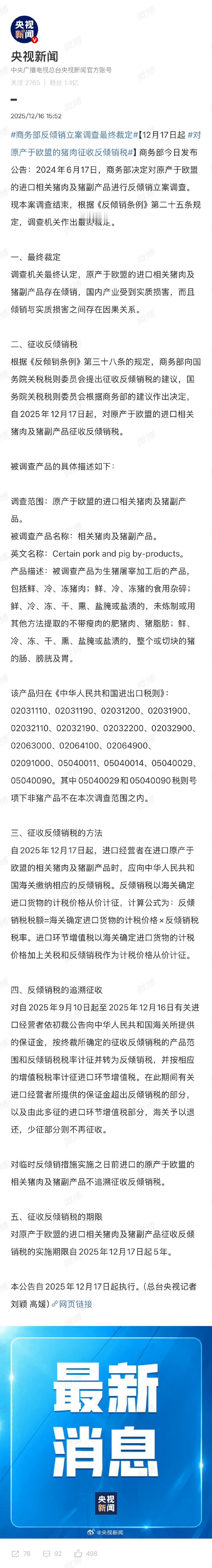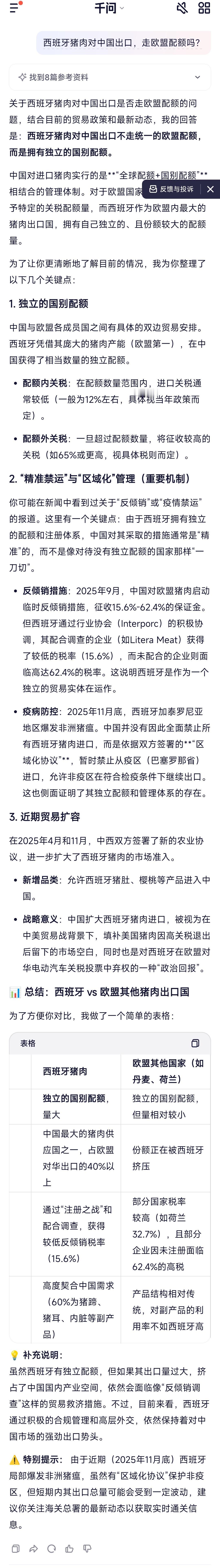 2025年12月17日-2030年12月16日,中国对欧盟进口猪肉及猪副产品征收反倾销税。 配合调查(配合提交问卷)的欧盟企业适用15.6%(如西班牙里泰拉肉类公司)。 未配合企业62.4%,荷兰32.7%。 你调查电动车补贴,2025年欧盟已对华发起6起反倾销调查,人家也不会给你面子。 目前,国内猪肉正在低位运行,这一对欧盟的棒喝对国内养殖户来说是个好消息,虽然影响不大。 西班牙猪肉对华出口占欧盟40%以上,且配额不在欧盟内,有独立配额。