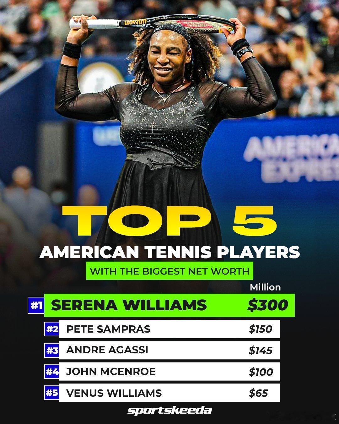 美国最富有的五位网球运动员:1、小威 3亿美元2、桑普拉斯 1.5亿美元3、阿加西 1.45亿美元4、麦肯罗 1亿美元5、大威 6500万美元热点现场