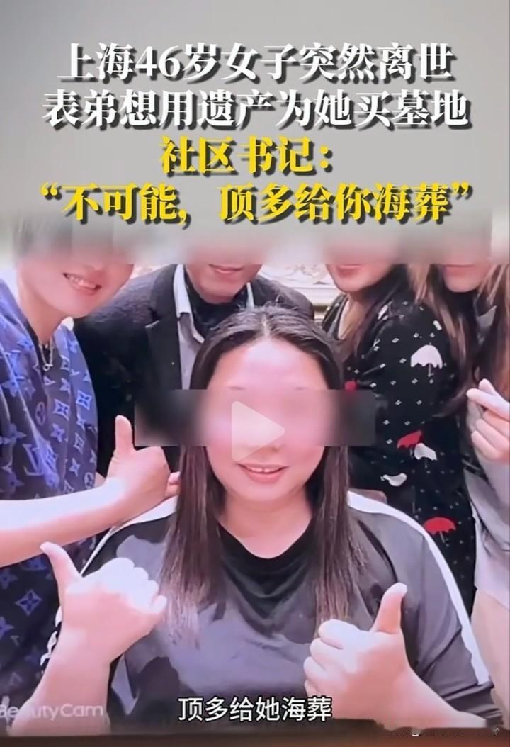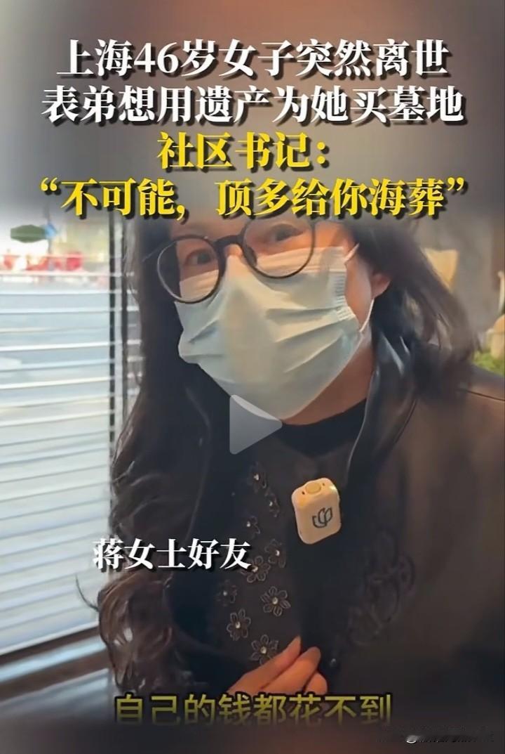 独身的尴尬!上海46岁独身女子突然离世,有大几百万的遗产,表弟想用遗产为她买个公墓,社区不同意。 今年10月,上海46岁的蒋女士突发脑溢血被同事送到了医院。因蒋女士未婚,无父母,连舅舅姑姑等直系亲属都没有,手术需人签字,幸亏她在入院还有点清醒时,扒拉了一圈,联系上了同在上海,一年只见一次面的远房表弟吴先生,(蒋女士是吴先生爷爷的姐姐的孙女)之后就陷入了昏迷,一直在重症室。 虽然蒋女士有存款和重疾险,因没有近亲属作为监护人,钱躺在银行,人躺在医院,没有合法的手续动用。 吴先生垫付了3万元后,面对21万元的欠费无力承担,在咨询了律师后向社区求助,希望社区作为监护人,动用蒋女士的存款救命。 社区与银行和保险公司沟通碰壁后,向法院求助,法院需先申请蒋女士为无民事行为或限制民事行为人,再通过相关流程指定监护人。 12月14日,蒋女士还是不幸离世。由于蒋女士没有监护人和继承人,她的遗产将依法由民政部门接收。 吴先生及蒋女士生前的好友想用遗产办个追思会和买块公墓,觉得蒋女士自己的钱用在自己身上也合理。 然而,社区书记说,不可能,只能海葬,如果吴先生愿意承办,可以提出书面申请,但购置墓地的支出需在合理范围内,且后续维修费用,仍需要由吴先生承担。 蒋女士的好友们也想不通,认为现在像蒋女士这样的独身有很多,自己的钱不能花,肯定心凉的。 蒋女士作好了养老的经济和医疗准备,却怎么也没算到46岁还没老的年纪却先倒下的,不仅在就医上遇到麻烦,身后事也不尽如意,真是人算不如天算。 独身的人注定有孤独带来的烦恼和忧伤,以后像这样的情况会越来越多。奉劝那些独身男女,早做好监护人准备,最好还是成家,早年有父母,中年有爱人,老了有孩子,心有归宿,情有出处,人生的体验更圆满。