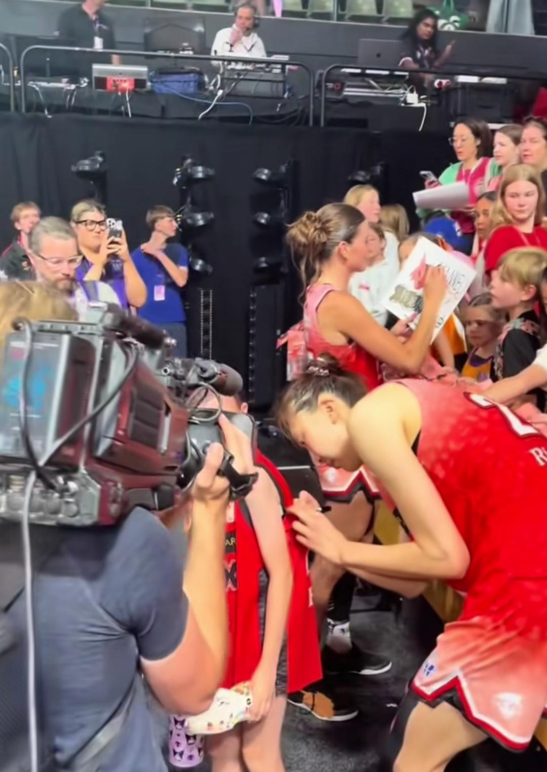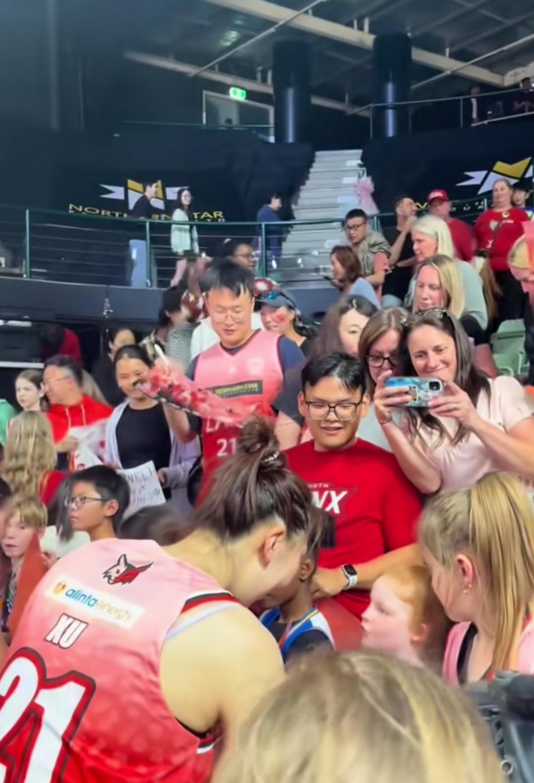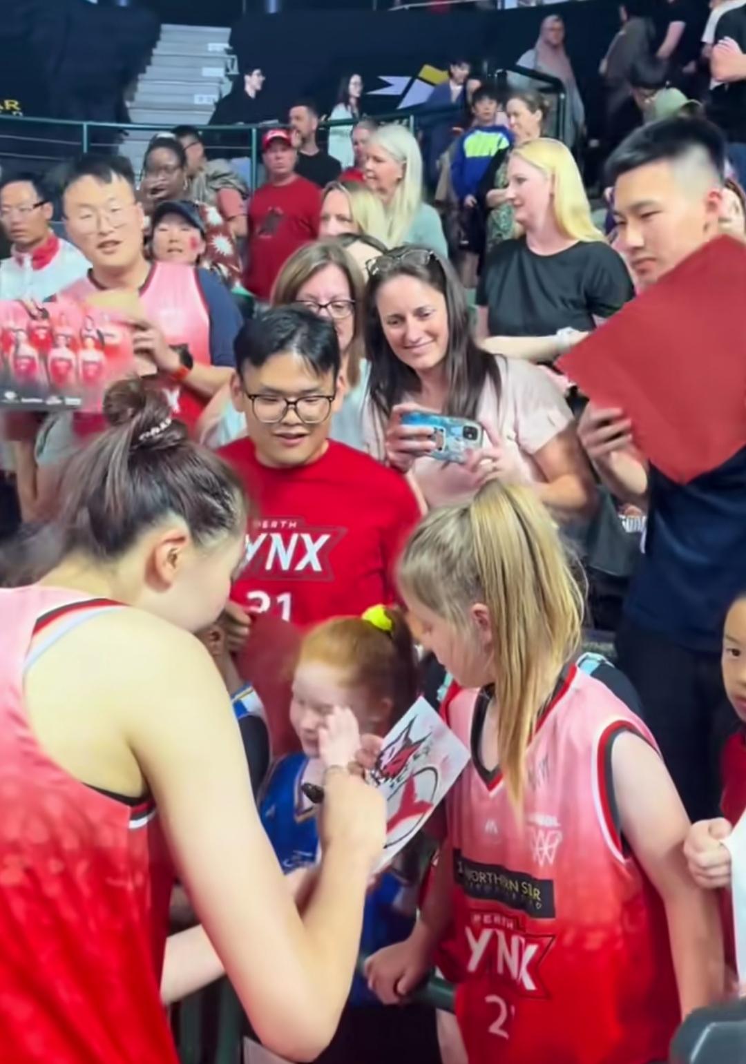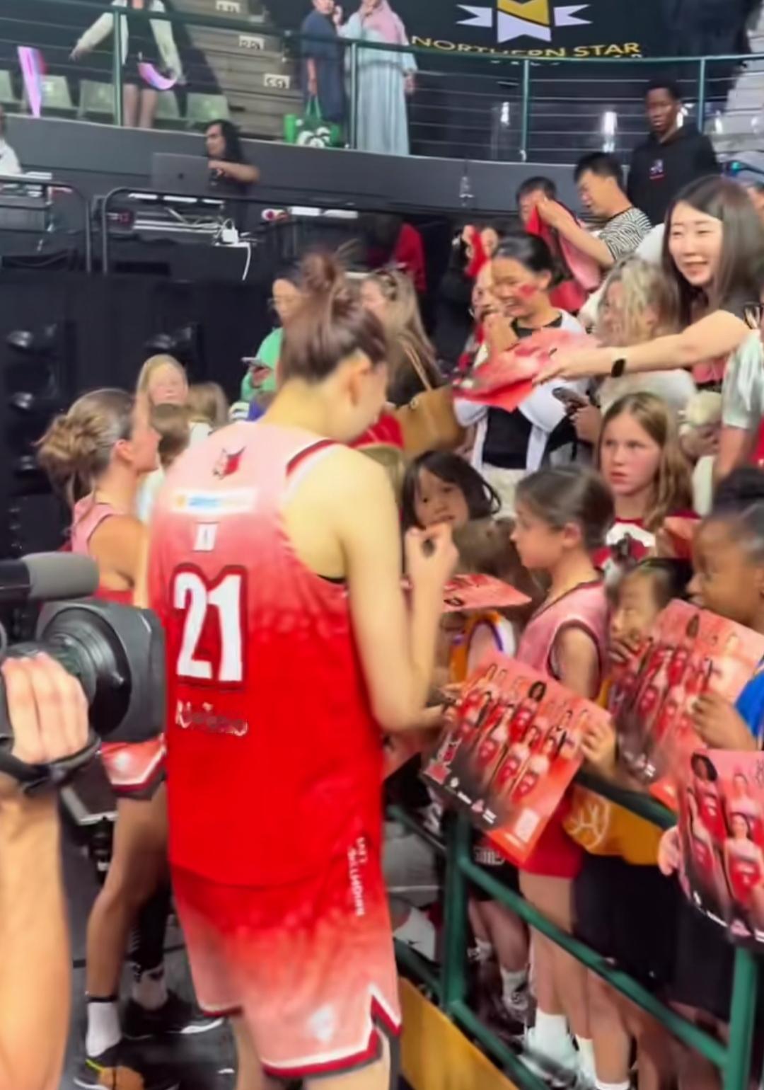 比赛结束后,韩旭不可能顺利回到更衣室!澳洲球迷们的热情根本挡不住。 特别是那些可爱的小球迷们,哭着喊着要签名,韩旭怎能置之不理呢。 她会尽力满足每一个小球迷的签名愿望。 韩旭之所以受到球迷们的热捧,绝对是实力使然。 作为全球身高第二的职业女球员,她在澳大利亚女篮联赛(WNBL)中,大杀四方,能里能外,简直就像库里与文班亚马合体! 几场数据下来,对其他球队来说,简直就像是降维打击。 目前,韩旭已经可以熟练使用英语,与队友和媒体进行沟通。 她的到来,也给珀斯山猫队,甚至整个城市带来了极大的关注。 12月14日,她带领球队击败了联赛领头羊。她个人贡献28分、13篮板、4盖帽、2抢断,数据相当全面。 期待早日可以看见她在国家队大展雄风。