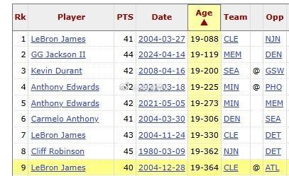 NBA常规赛,独行侠加时133-140不敌爵士。此役,独行侠状元弗拉格砍下42分,他(18岁360天)也成为唯一一个在18岁就砍下40+的NBA球员。据统计,历史上在20岁之前单场贡献40+的除弗拉格外也只有以下球员:詹姆斯,3次爱德华兹,2次杜兰特,1次安东尼,1次克利福·罗宾逊,1次GG·杰克逊,1次