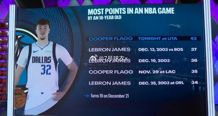 NBA常规赛,独行侠加时133-140不敌爵士。本场比赛,独行侠状元弗拉格表现出色,再次刷新生涯得分新高(此前35分),在42分钟的时间里,投篮27中13,三分球4中1,罚球20中15,空砍42分7篮板6助攻1抢断2盖帽的数据。据统计,18岁球员单场得分榜前五如图,詹姆斯和弗拉格霸榜。