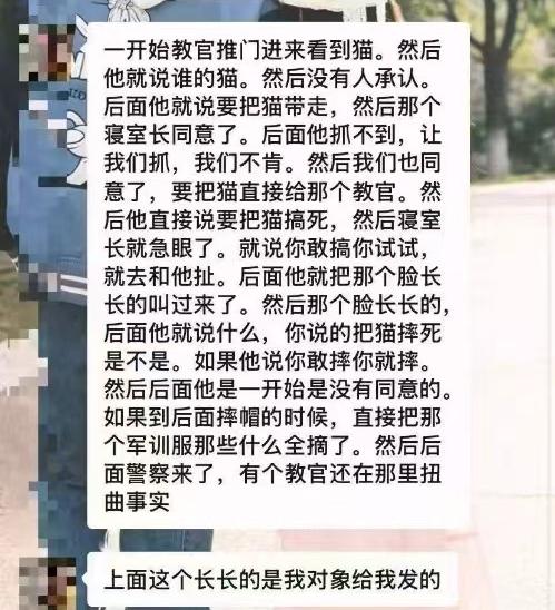 究竟孰是孰非?网传湖南湘西某学校查寝教官活活摔死幼猫事件的背后,竟是学生的嚣张挑衅! 11月15日,湖南湘西一学校男生宿舍查寝时,教官在一宿舍发现了一只灰色狸花猫幼崽。教官询问是谁的,没有人承认,教官便说:“没人承认的话就把猫带走了啊!” 寝室长同意了,教官便开始抓猫。但猫咪很灵活地到处逃窜,教官抓不住,于是就让该宿舍的男生帮忙一起抓,没有人帮忙。 最后教官抓住了猫咪,说了一句:“带过去把它搞死。” 一名男生当时就急眼了,拿起手机开始录像,并连续说了四十多次:“你摔啊,你摔一个试试?” 期间另一名教官试图缓解矛盾:“你把手机放下别拍了,我把猫带回去,以后别带过来了。” 该男生就像没看到一样,继续挑衅教官:“你不是说你要摔死它吗?你摔啊,你摔一个试试!” 在男生不断的挑衅下,教官最终被激怒,才出现了网传的那一幕! 网上流传的视频中教官称:“是猫主人同意的!”并不是教官为了逃脱责任而找的借口,也不是猫主人真的同意了,而是教官在这位同学的一再挑衅下失去了理智,才残害了一条幼小无辜的生命! 猫咪长得很可爱,才三四个月大,像个毛茸茸的毛线团子。可惜跟错了主人,在这种情况下主人如果真心想要保护猫咪,就绝不会发生这样的悲剧! 学生与教官赌气,一再挑衅教官,以牺牲猫咪的性命为代价。而教官或许又觉得被学生这样一再挑衅跟丢面子,最终失去了理智,不顾猫咪的惨叫与挣扎,将猫咪一次又一次狠狠地摔到地上,导致猫咪在一分钟内便彻底死亡! 在教官真的摔猫咪的时候,没有一个人去阻止!叫嚣的学生只顾着拍视频激怒教官试图拿住其把柄,而教官又觉得太丢面子,最终导致了这场悲剧! 所以究竟是谁的错呢?对此,你怎么看呢? 虐猫
