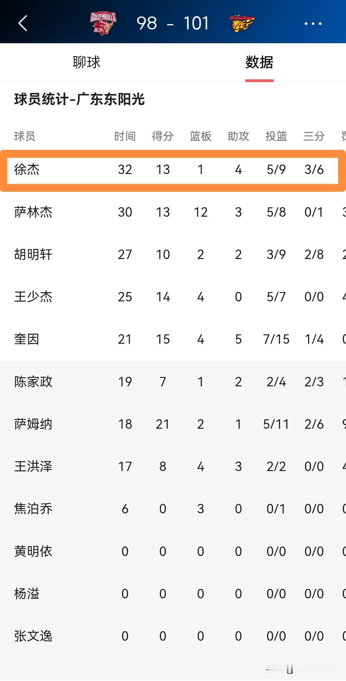 我真的要怒赞广东东阳光后卫徐杰!在今天广东东阳光客场以101:98力克浙江稠州金租的比赛中,徐杰首发出战32分钟,投篮9中5,其中三分球6中3非常高效的得到13分4助攻2抢断。虽然徐杰的得分并不是很高,但是他的得分全是关键得分,每当浙江稠州金租将比分迫近的时候,徐杰就会用得分来压制住对手的进攻。 在我看来,徐杰才是广东东阳光真正的核心,他在球队的作用是最大的。
