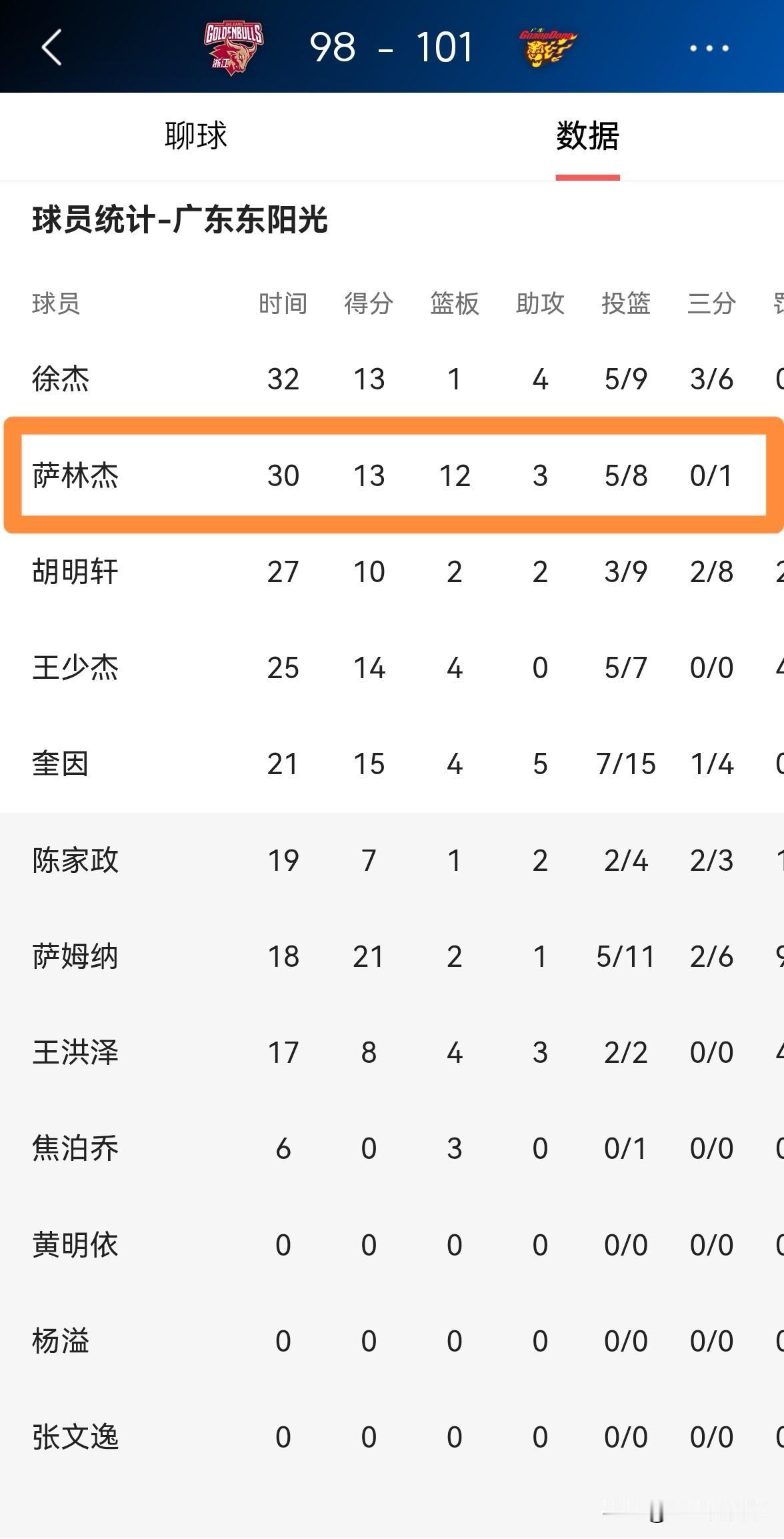 广东东阳光大外援萨林杰真是太好用了!在今天广东东阳光客场以101:98险胜浙江稠州金租的比赛中,萨林杰首发出战30分钟,投篮8中5,其中罚球8中3得到13分12篮板3助攻1抢断,他的场上正负值为+9。 虽然萨林杰已经33岁了,但是他依然非常的全面高效,他能攻善守、会组织串联而且具备非常强的篮板球拼抢能力,萨林杰就像是CBA的约基奇一样。