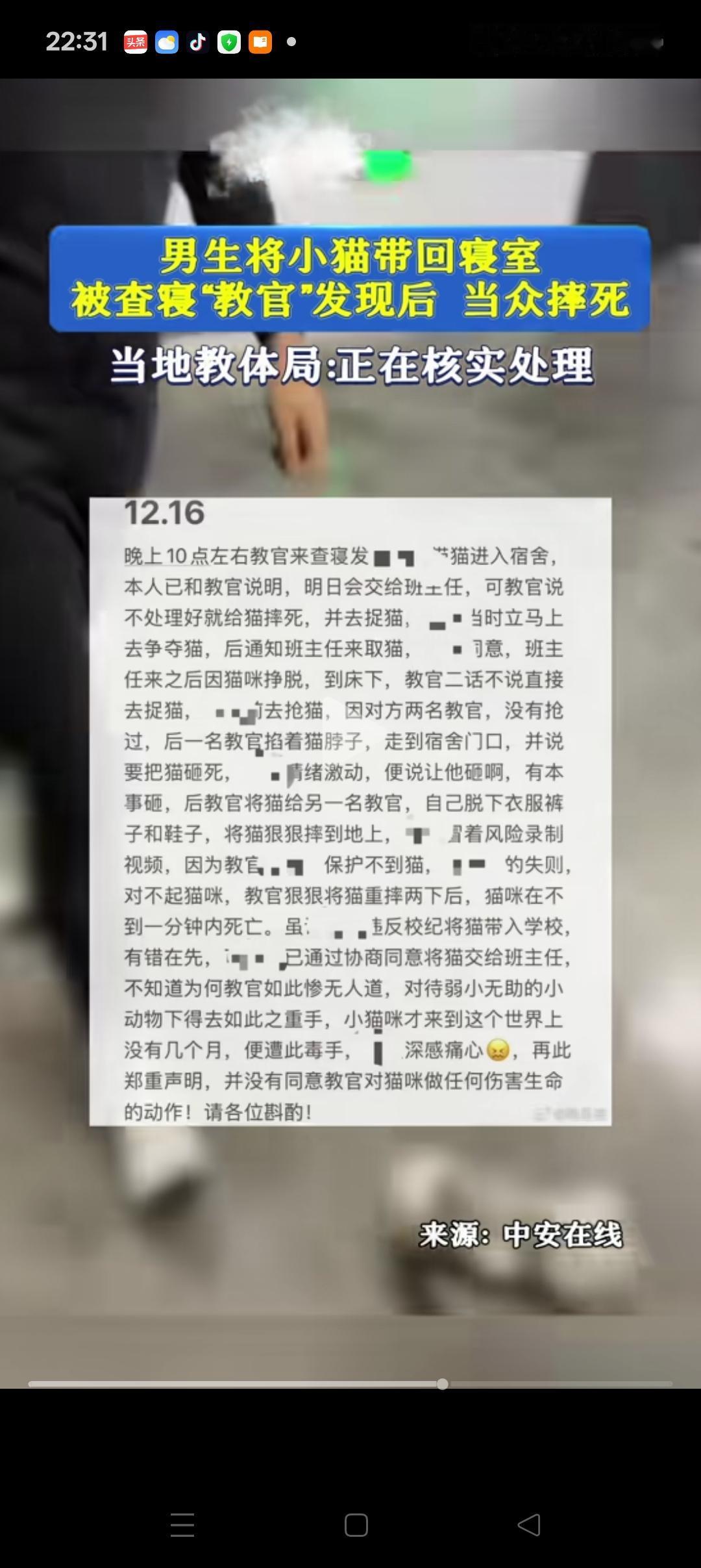 真相来了!看到宿管摔猫的完整视频,原来坏的人不止男宿管,还有那个一直嚷嚷着“你摔啊,你摔啊”的学生,可以说比宿管更可恨。 因为原本宿管并没有摔猫的意思,只是想让男生把猫咪送走。但男生一再怼他,彻底激怒了他,他才做了这种事。 但不管怎么说,作为一个成年人,也不应该摔猫。而且他还摔了好几次,看的好心疼[流泪][流泪]。 这个男生一点也不善良,自己养的猫,居然能够这么看着被摔,还特意拱火。而且看到猫咪在地上抖动的样子,全程没有一点愧疚,看着就气人[发怒][发怒] 我真想冲上去跟他们理论下,今晚都睡不着了[流泪][流泪]